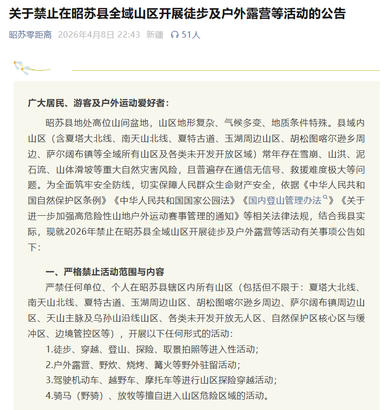 据“昭苏零距离”微信公众号4月8日深夜消息,昭苏县文化体育广播电视和旅游局当天发布公告,宣布2026年全县所有山区严禁任何形式的徒步、穿越、登山、露营、越野穿越,涉及夏特古道、夏塔大北线、南天山北线等线路。