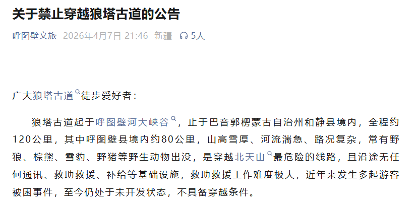 同日,“呼图壁文旅”微信公众号再次重申,禁止穿越狼塔古道。公告称,狼塔古道全程约120公里,其中呼图壁县境内约80公里,是穿越北天山最危险的线路,且沿途无任何通讯、救助救援、补给等基础设施,救助救援工作难度极大,至今仍处于未开发状态,不具备穿越条件。