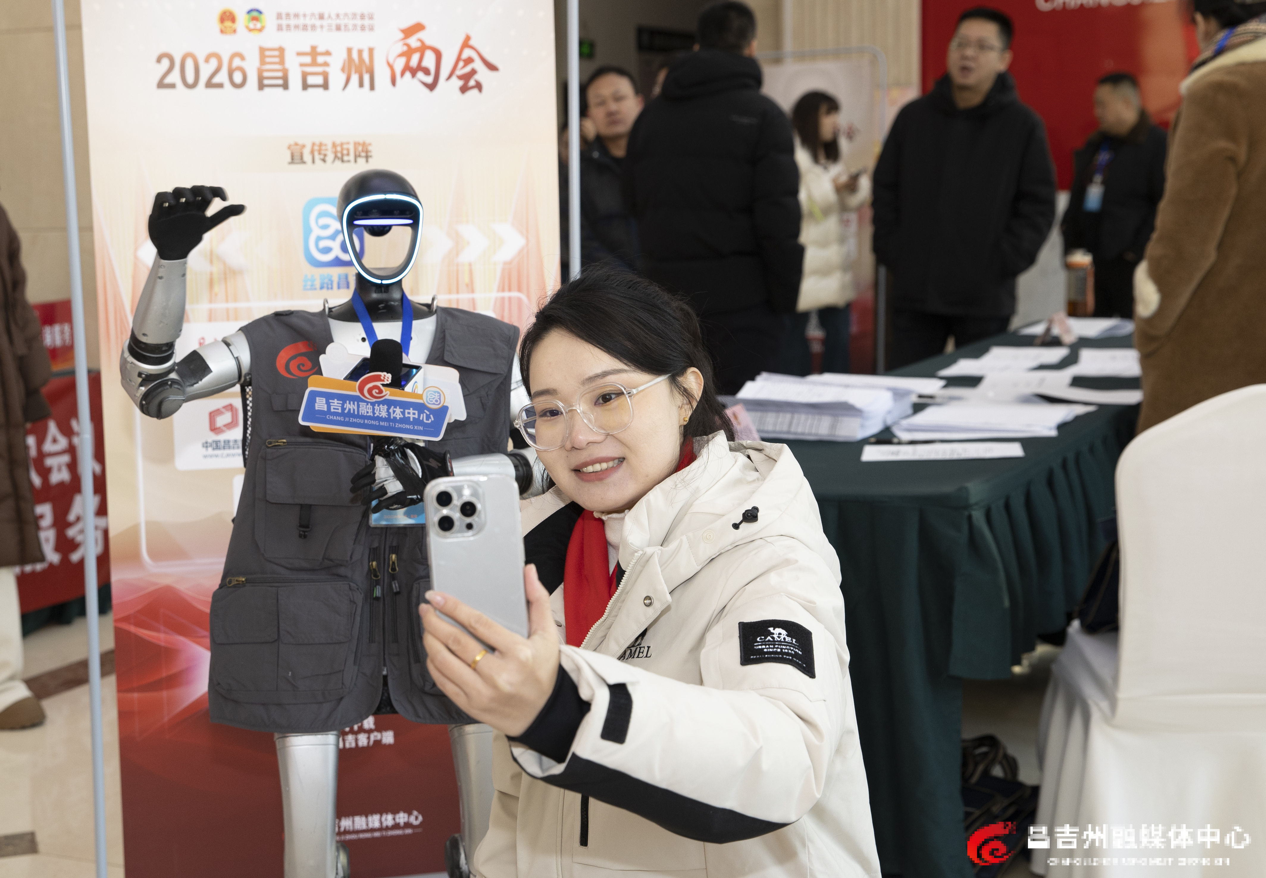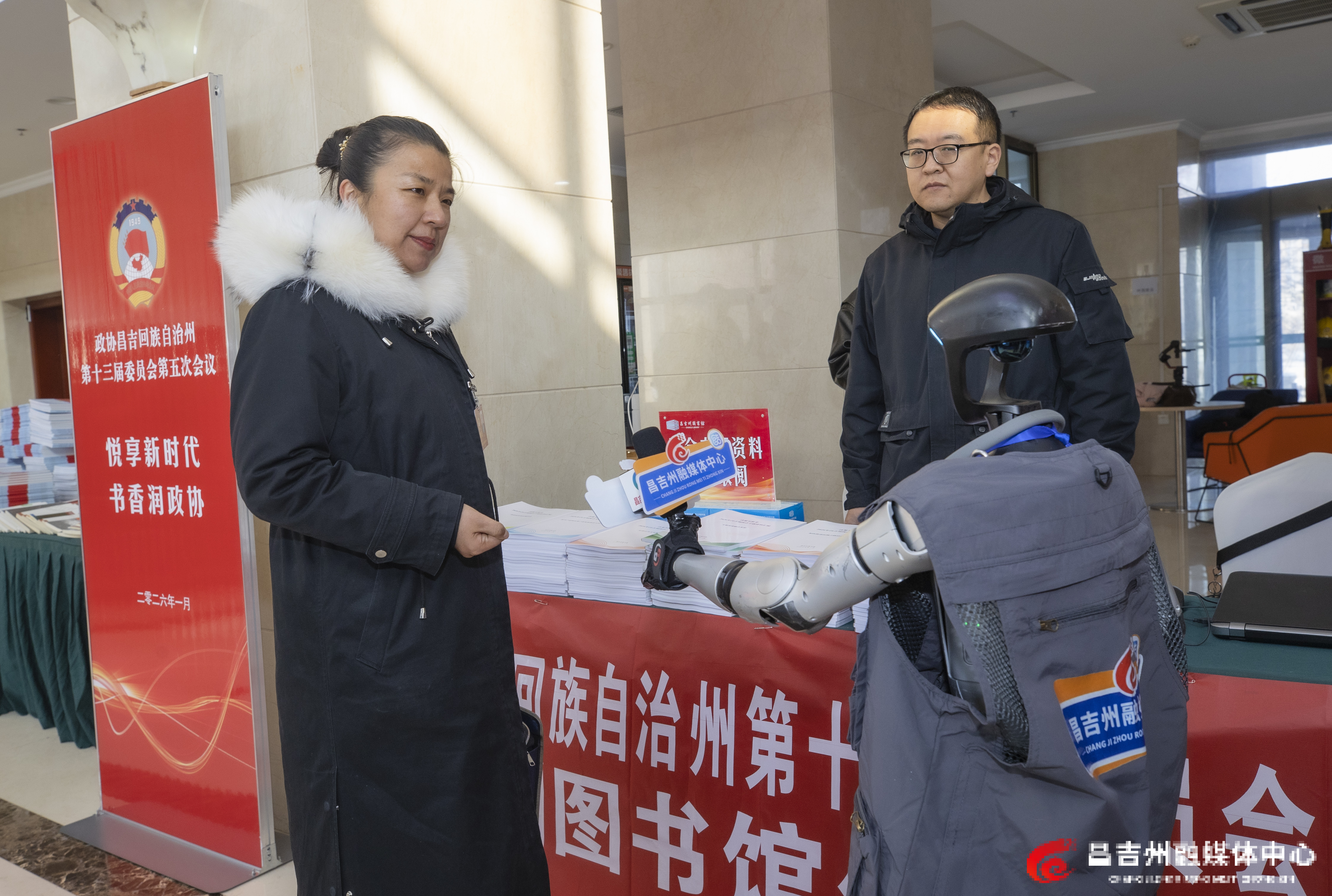 1月18日,在昌吉州政协十三届五次会议报到现场,昌吉州融媒体中心记者与机器人记者“天山”联合采访出镜。
