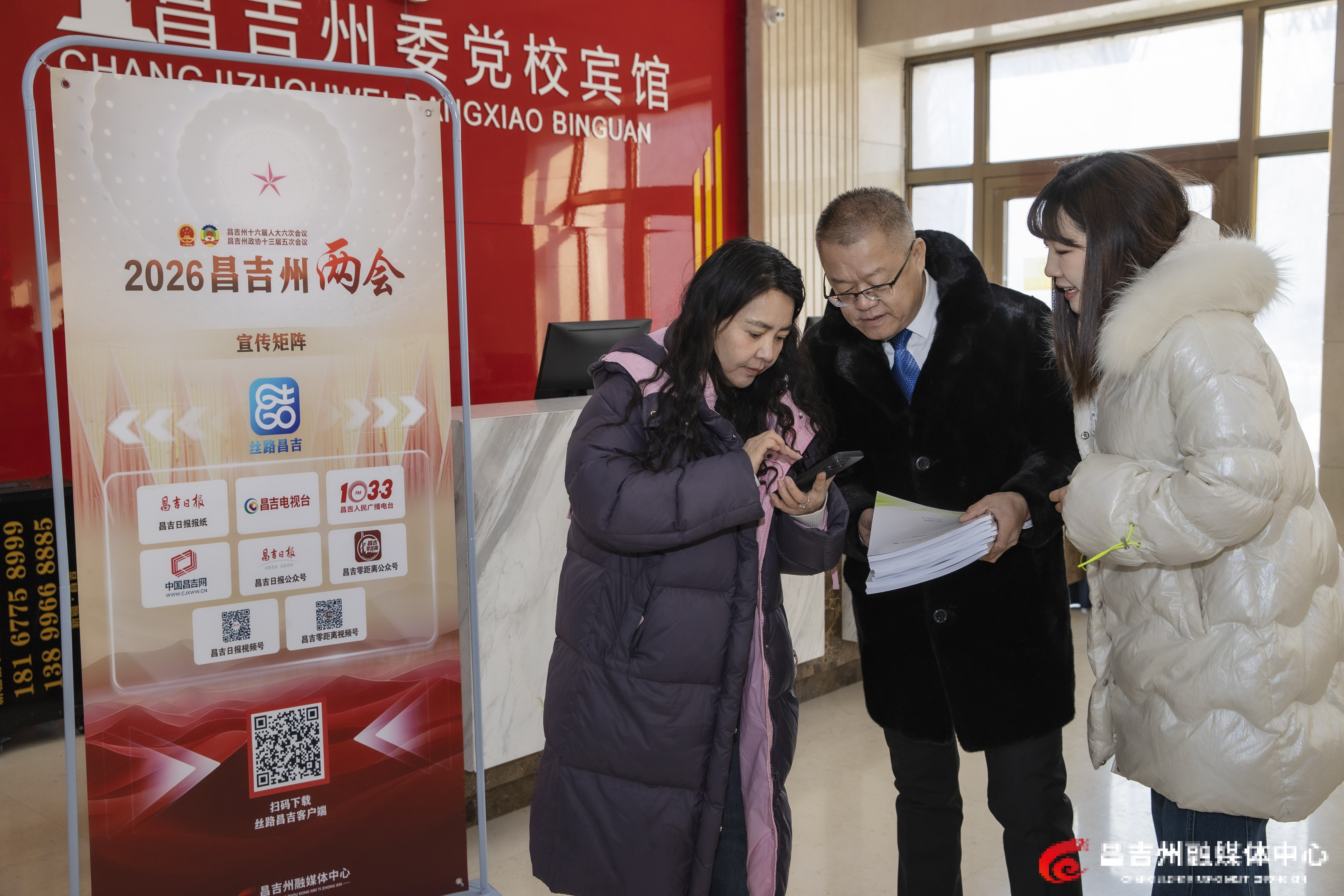 1月18日,出席昌吉州政协十三届五次会议的政协委员在昌吉州融媒体中心工作人员的指引下,下载丝路昌吉客户端,关注“两会朋友圈”专区,参与互动。