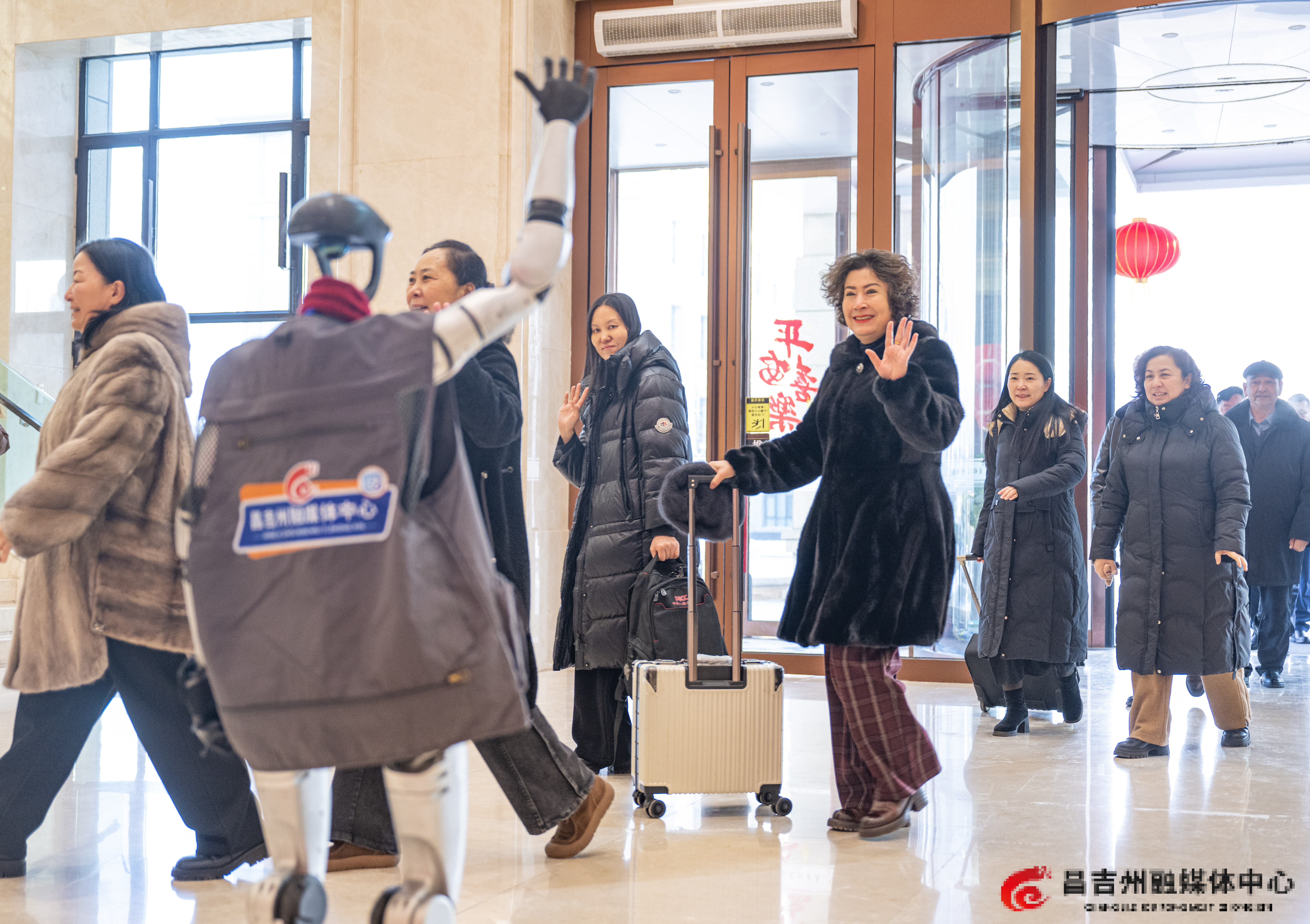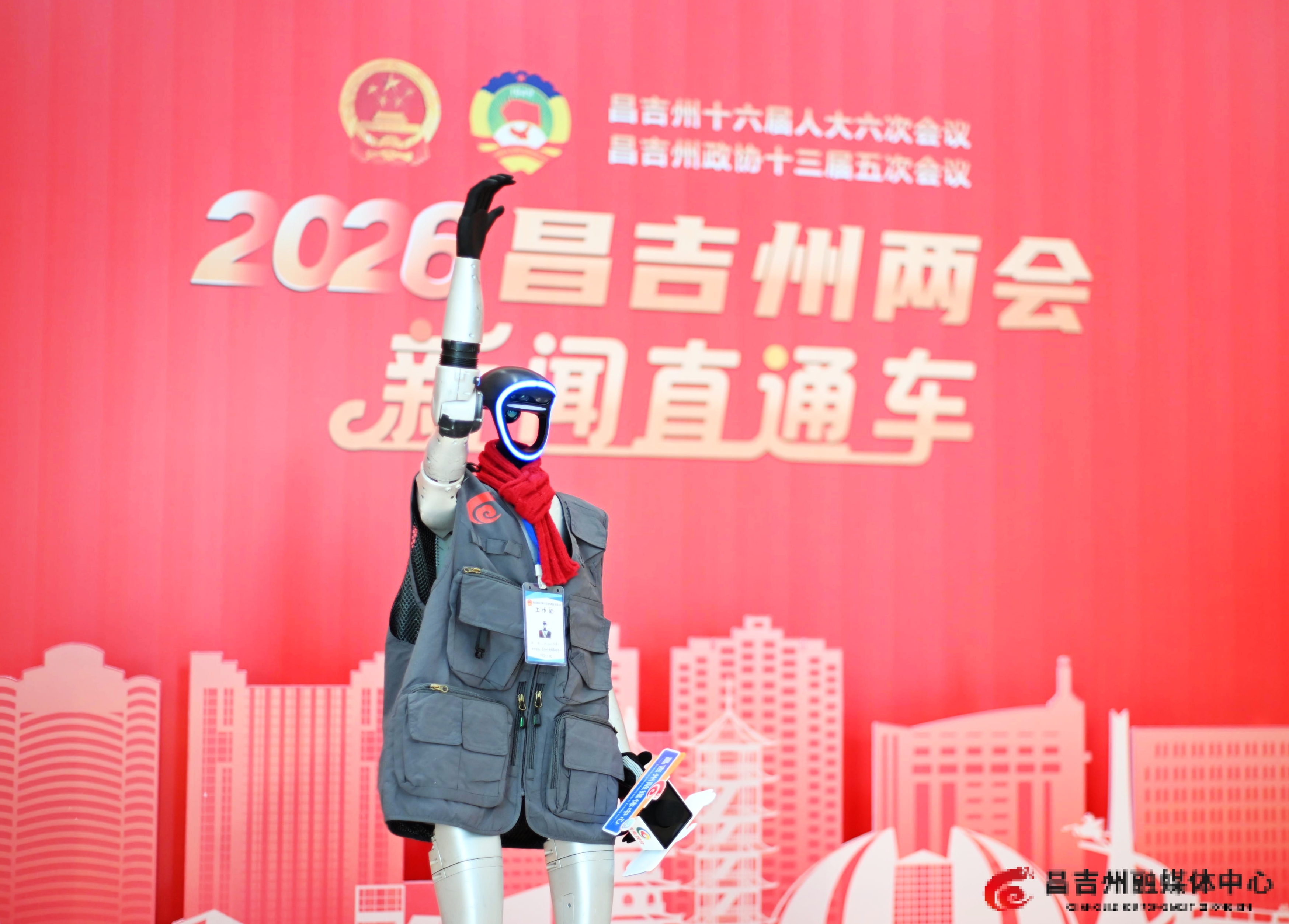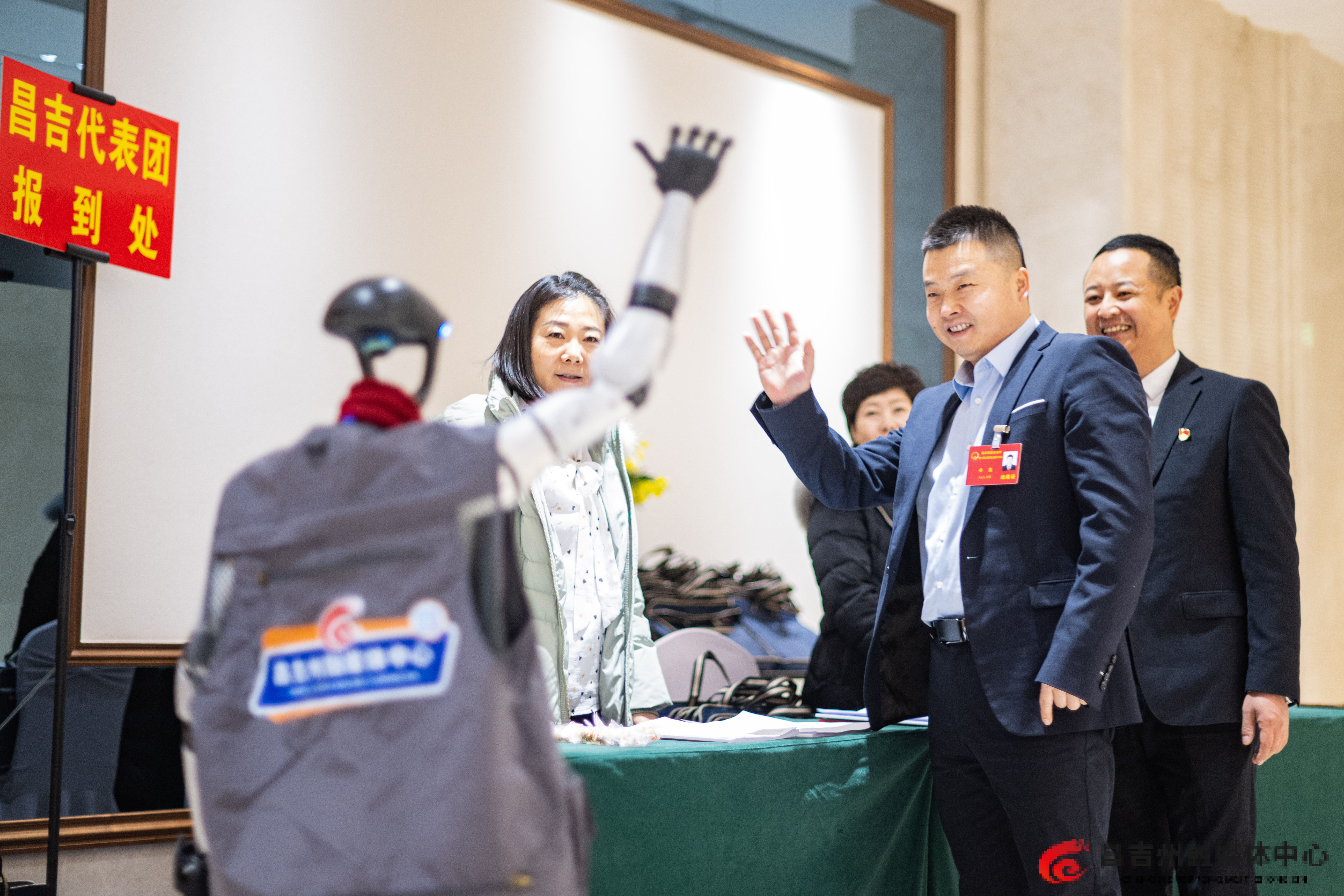 1月19日,昌吉州十六届人大六次会议驻地,机器人记者“天山”迎接前来报到的人大代表。