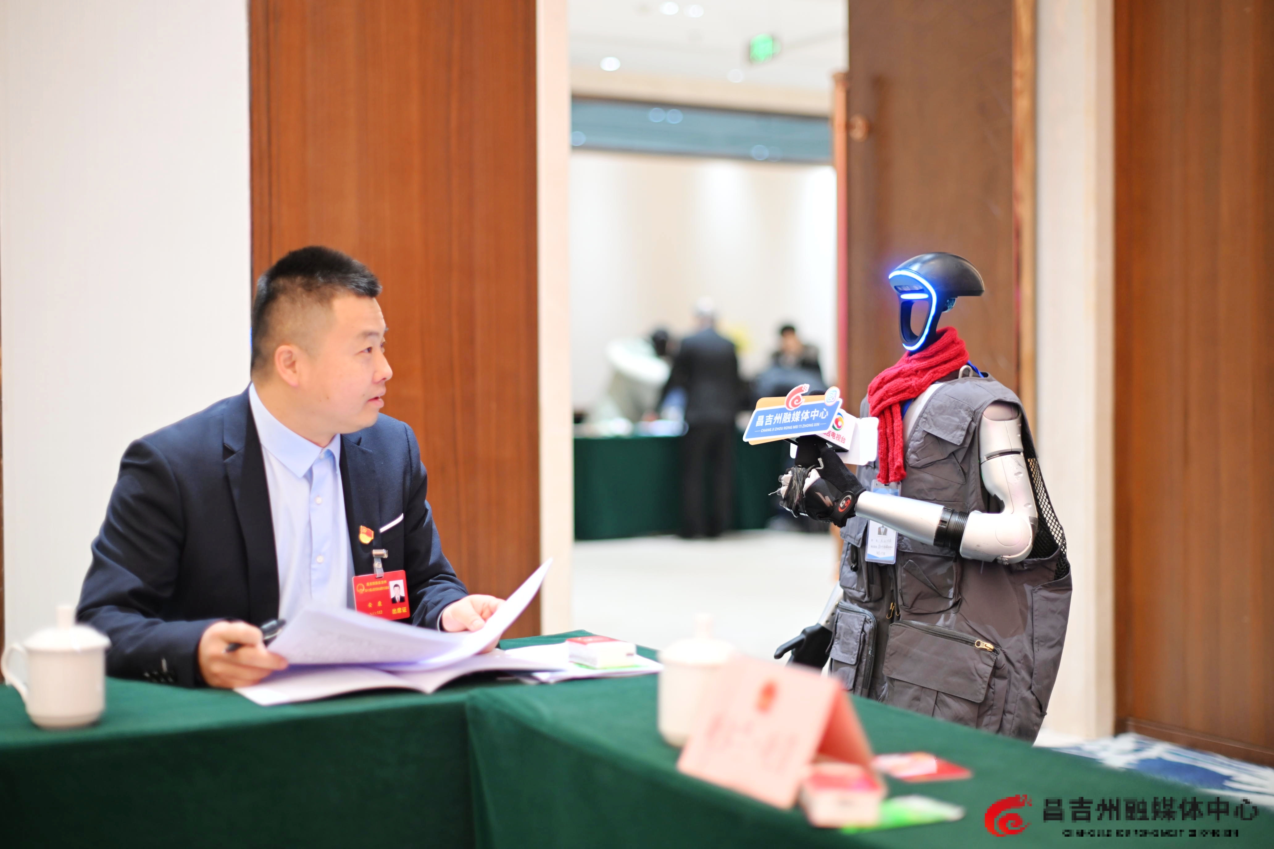 1月19日,出席昌吉州十六届人大六次会议的人大代表在接受机器人记者“天山”的采访。