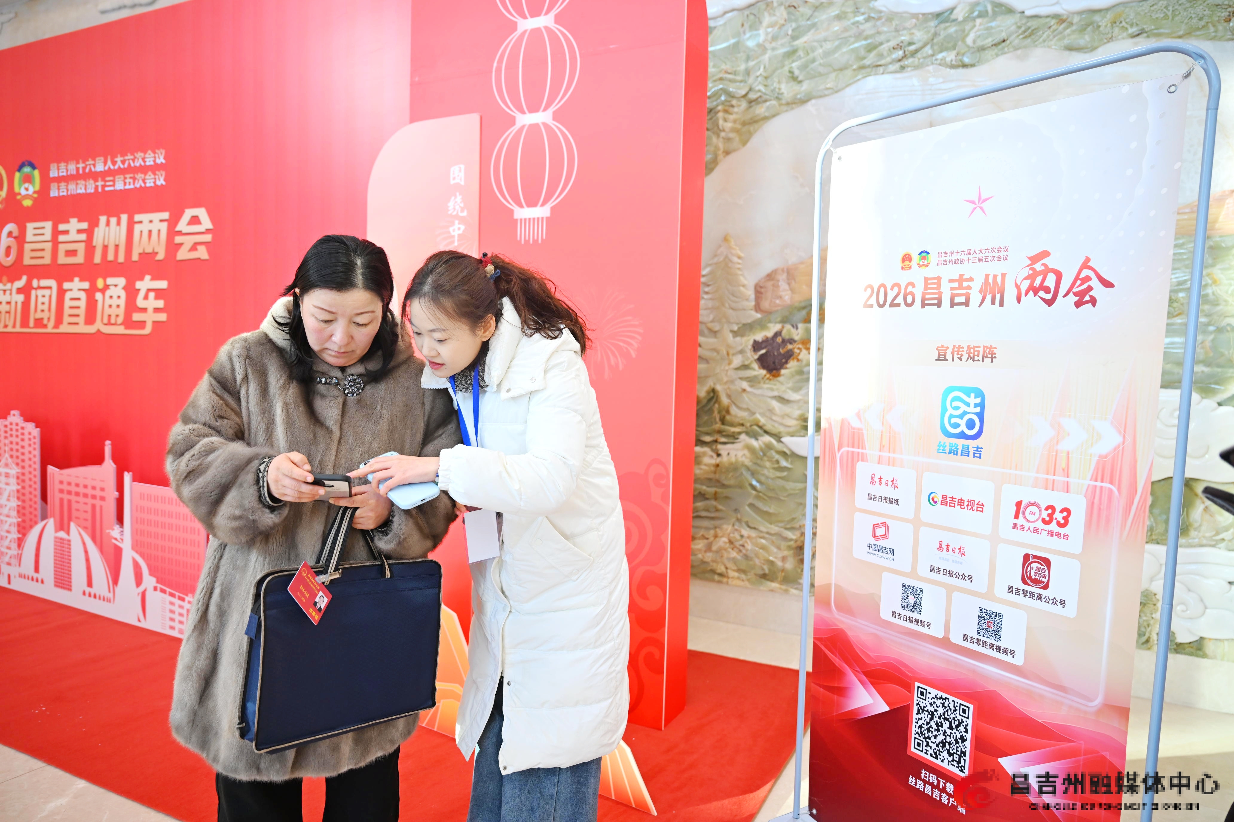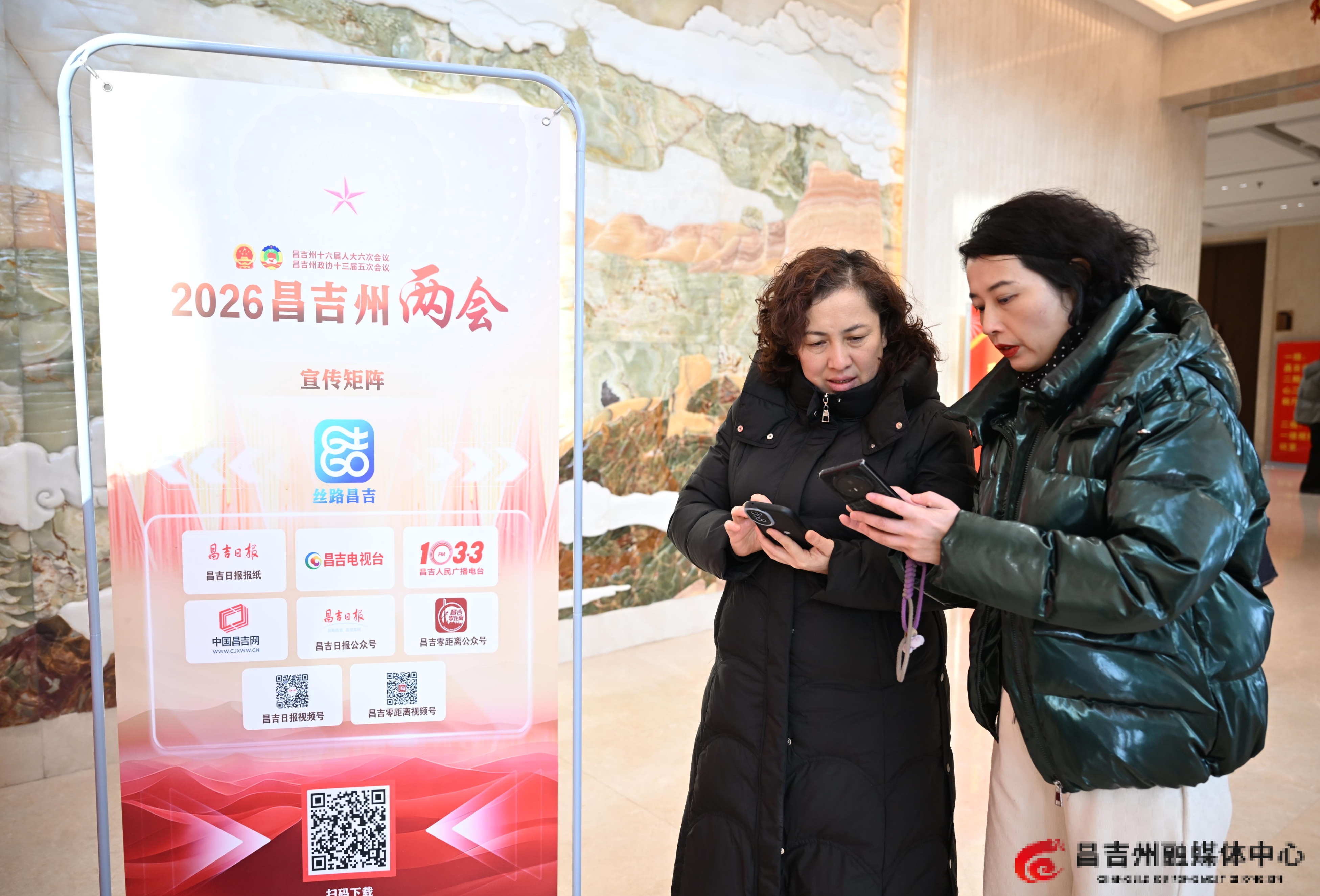 1月19日,出席昌吉州十六届人大六次会议的人大代表在昌吉州融媒体中心工作人员的协助下,下载丝路昌吉客户端,关注“两会朋友圈”专区,参与互动。
