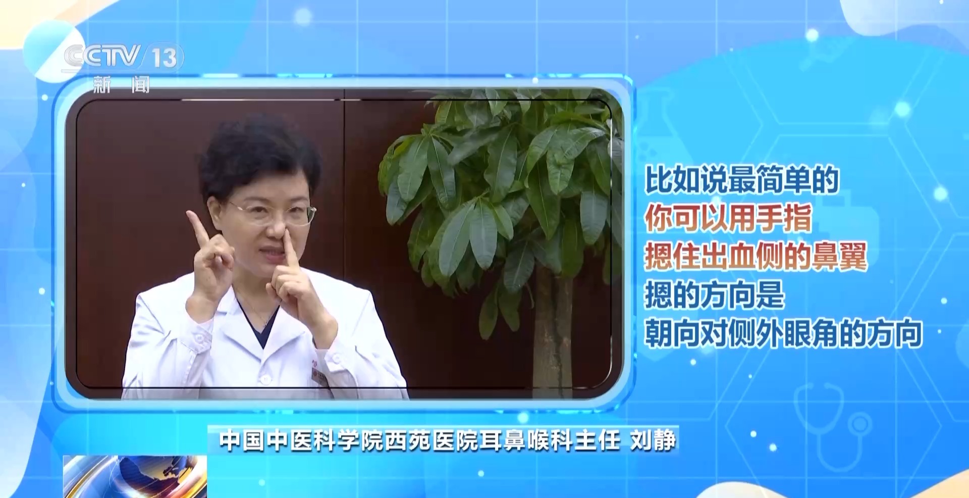 医生介绍,最简单的做法,可以用手指摁住出血侧的鼻翼,摁的方向是朝向对侧外眼角的方向,可以止住大部分的鼻出血。