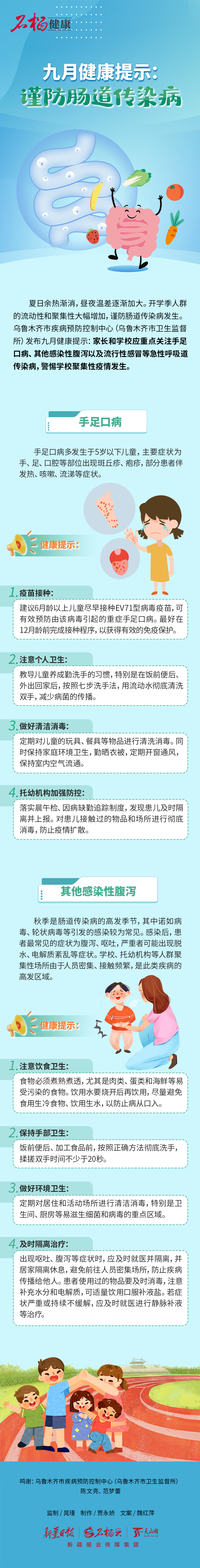 夏日余热渐消,昼夜温差逐渐加大。开学季人群的流动性和聚集性大幅增加,谨防肠道传染病发生。乌鲁木齐市疾病预防控制中心(乌鲁木齐市卫生监督所)发布九月健康提示:家长和学校应重点关注手足口病、其他感染性腹泻以及流行性感冒等急性呼吸道传染病,警惕学校聚集性疫情发生。