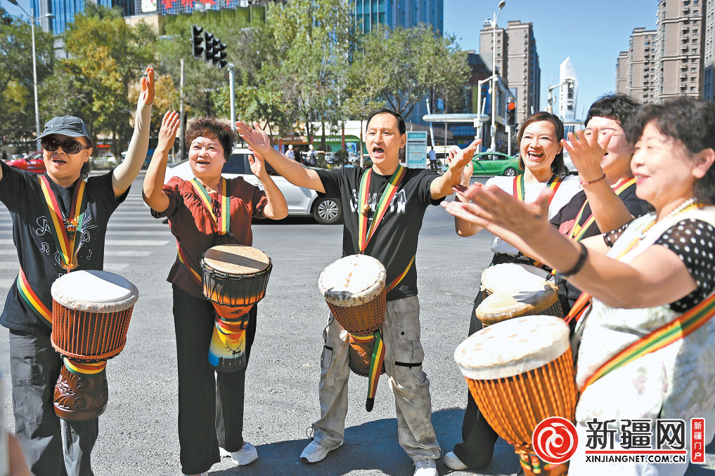 8月27日,在水磨沟区源凯第一城点位,南湖北路街道的演员们在排练舞蹈《鼓舞飞扬》。 (记者雷婷摄)