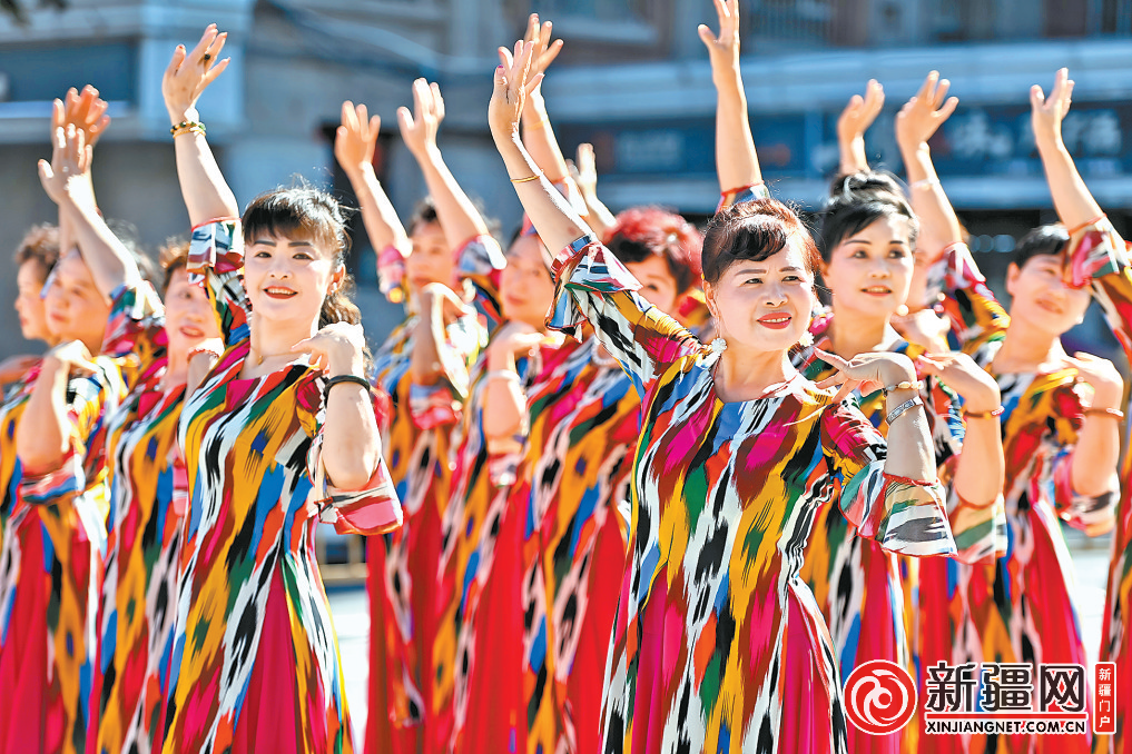 8月27日,在水磨沟区新民路宏大广场点位,新民路街道的演员们在排练舞蹈《美丽新疆》。 (记者雷婷摄)