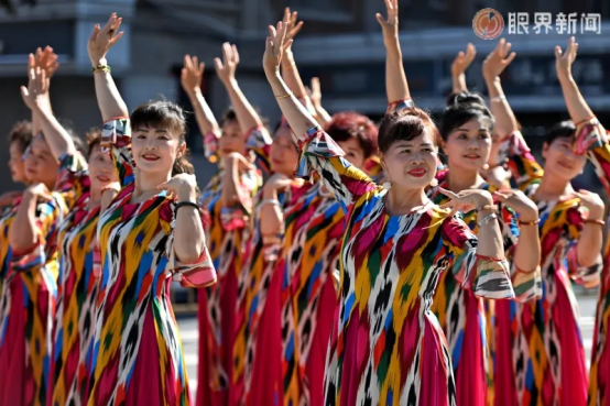 水磨沟区益民大厦前,华光街街道斜井东社区工作人员自编自演舞蹈《美丽新疆》,以优美舞姿展现新疆的壮美与神秘。