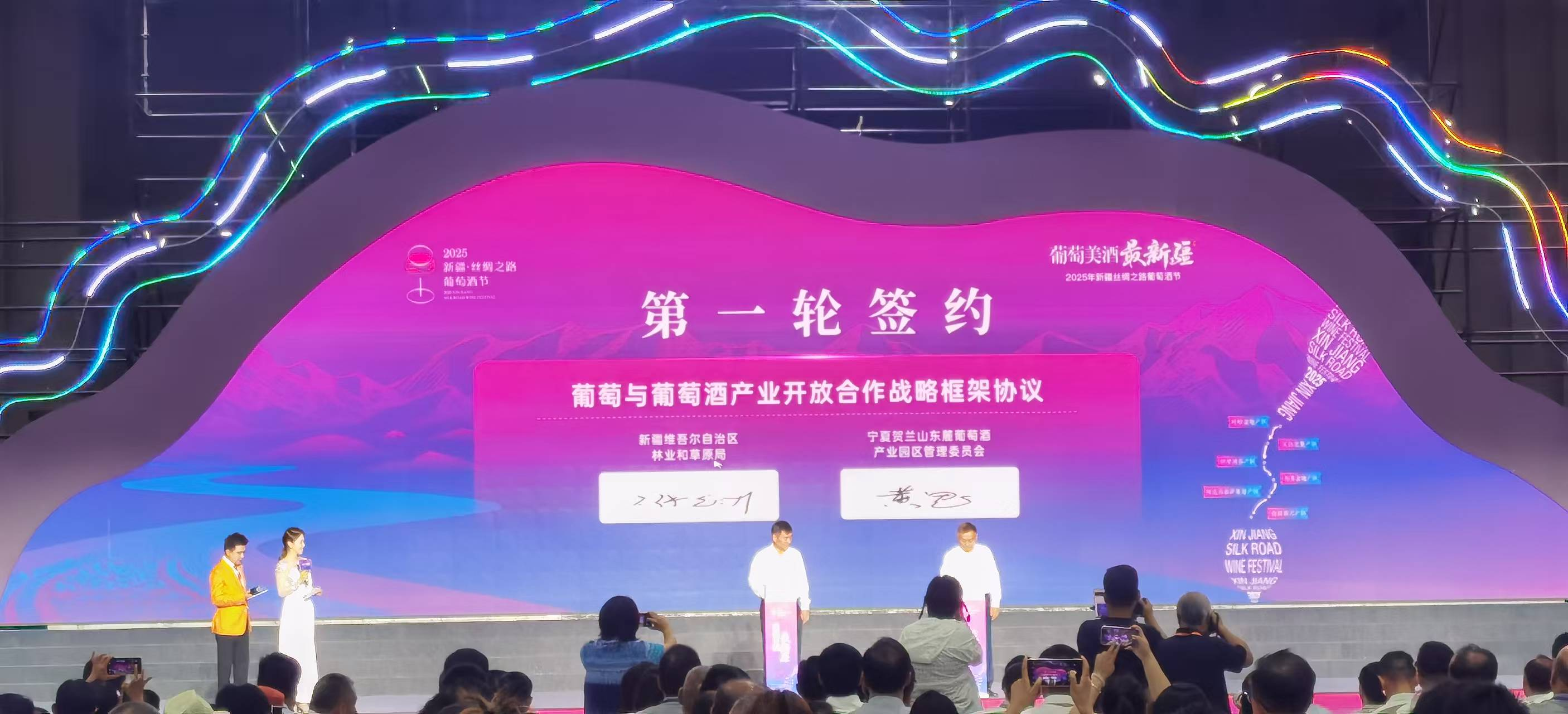 签约仪式上,自治区林业和草原局与宁夏贺兰山东麓葡萄酒产业园区管理委员会签订开放合作战略框架协议,克孜勒苏柯尔克孜自治州人民政府与宁夏西鸽葡萄酒产业集团有限公司签约建设4.9万平方米酒庄及3万亩葡萄园(总投资5亿元),巴州葡萄酒协会与中国酒类流通协会零售及连锁专业委员会达成战略协作。据自治区林业和草原局林果产业发展处副处长徐波介绍,本次节会初步达成6亿多元采购协议,未来还将邀请国际参展商与采购商参与,“真正将葡萄酒节打造成为具有国际影响力的重要平台”。