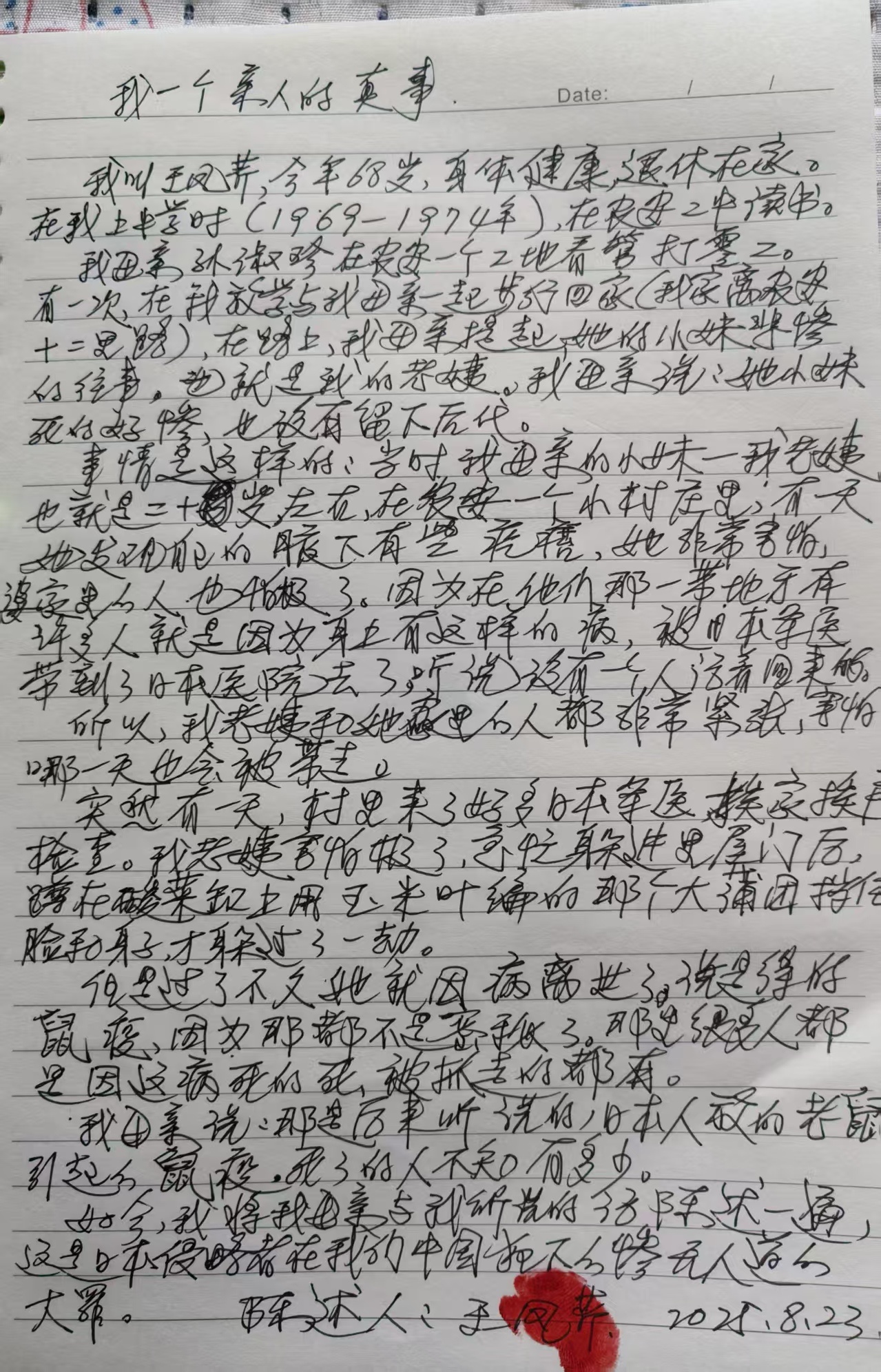 另据马燕女士提供的她二姨王凤芹(与马燕母亲同母异父)手写的资料显示:1940年6月在农安的家里,她的小姨姥有一天忽然发现腋下有些疙瘩,她非常害怕,因为当时他们附近的乡亲不少人就是身上长了莫名其妙的疙瘩,然后就被日本人带到日本医院去了,没一个人活着回来,她和婆家人都非常恐慌。不久,日本军医进村,开始挨家挨户查询并带走身上长异物及生病的人。她吓得赶紧躲起来,逃过了日本人的搜查,可是没过多久就不幸去世了。她的姥爷,也就是马燕的太姥爷,也几乎同时去世了。