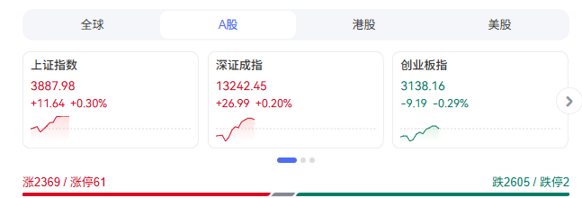 A+ A. A-9月18日上午开盘,A股三大指数震荡走强,沪指冲击3900点仅一步之遥,报3899.96点。截至发稿,沪指涨0.3%,深证成指涨0.2%,创业板指跌0.29%。