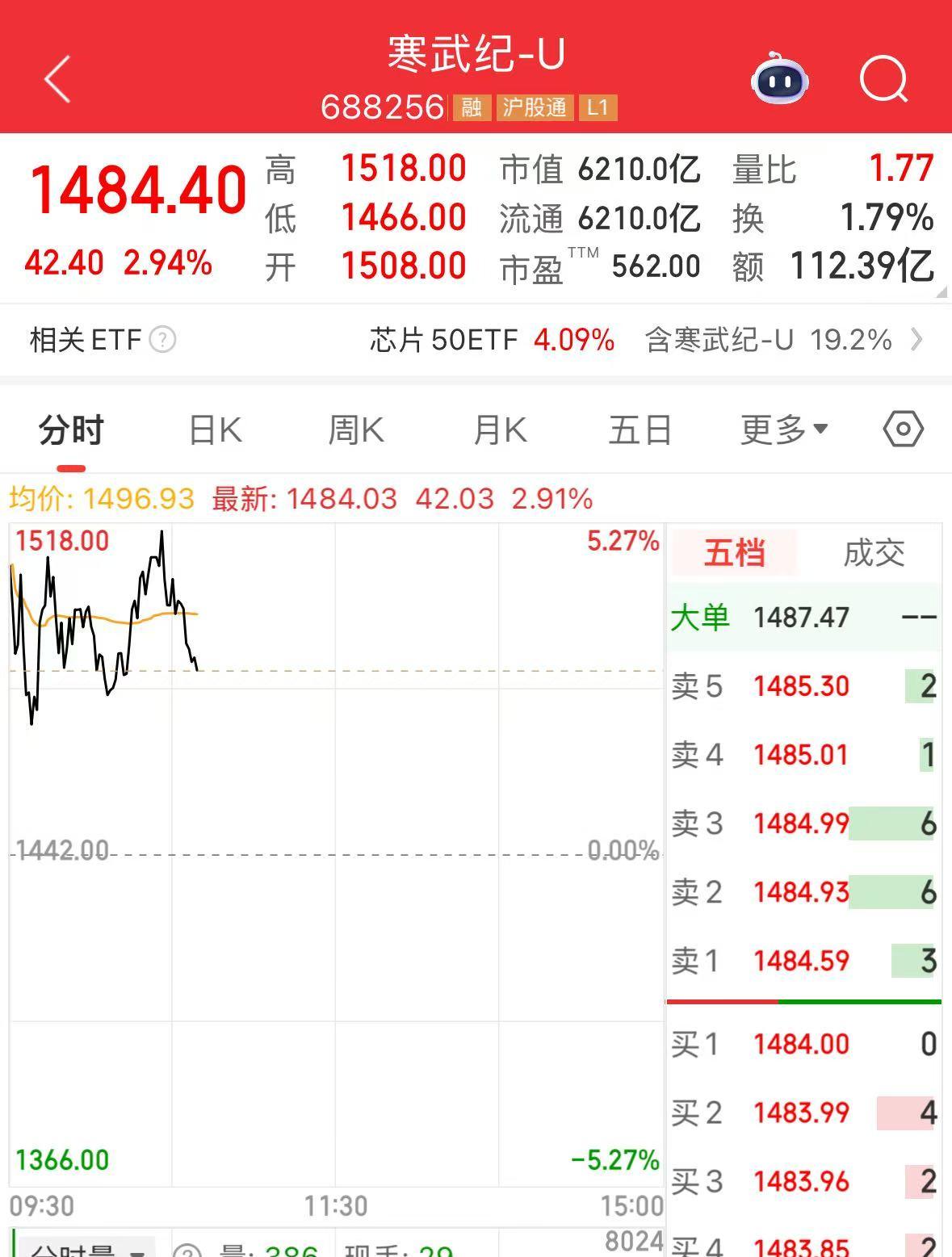 寒武纪盘中一度涨超5%,股价重新突破1500元关口,再次超越贵州茅台。发稿前股价有所回落,涨2.94%,报1484.40元/股。
