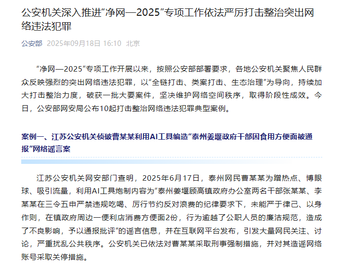 江苏公安机关网安部门查明,2025年6月17日,泰州网民曹某某为蹭热点、博眼球、吸引流量,利用AI工具炮制内容为“泰州姜堰顾高镇政府办公室两名干部张某某、李某某在三令五申严禁违规吃喝、厉行节约反对浪费的纪律要求下,未能严于律己、以身作则,在镇政府周边一便利店消费方便面2份,行为逾越了公职人员的廉洁规范,造成了不良影响,予以通报批评”的谣言信息,并在互联网平台发布,引发大量网民关注、讨论,严重扰乱公共秩序。公安机关已依法对曹某某采取刑事强制措施,并对其造谣网络账号采取关停措施。