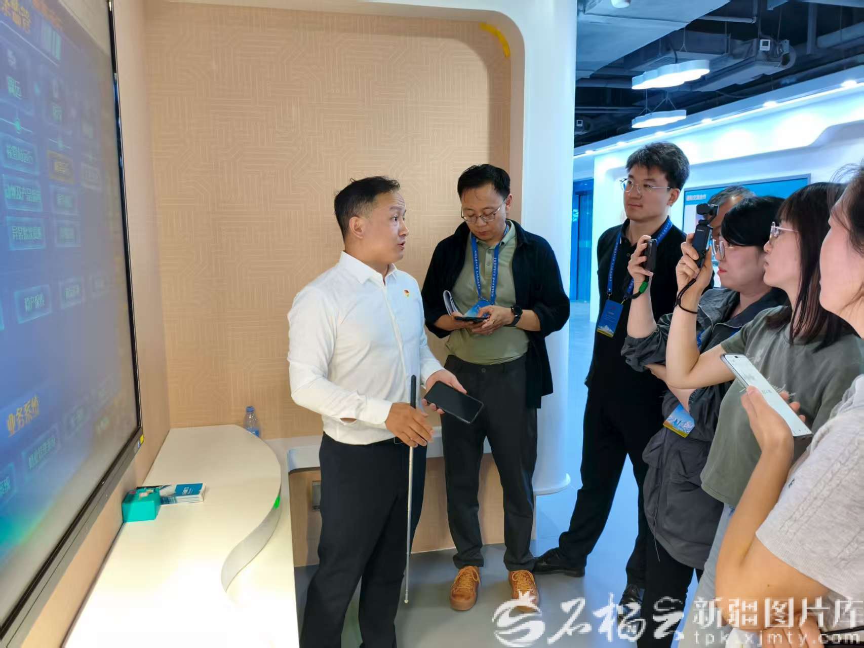 新疆七色花信息科技有限公司总经理谢彪向采访团记者介绍新疆畜牧业数字化发展情况。石榴云/新疆日报记者冉虎 摄