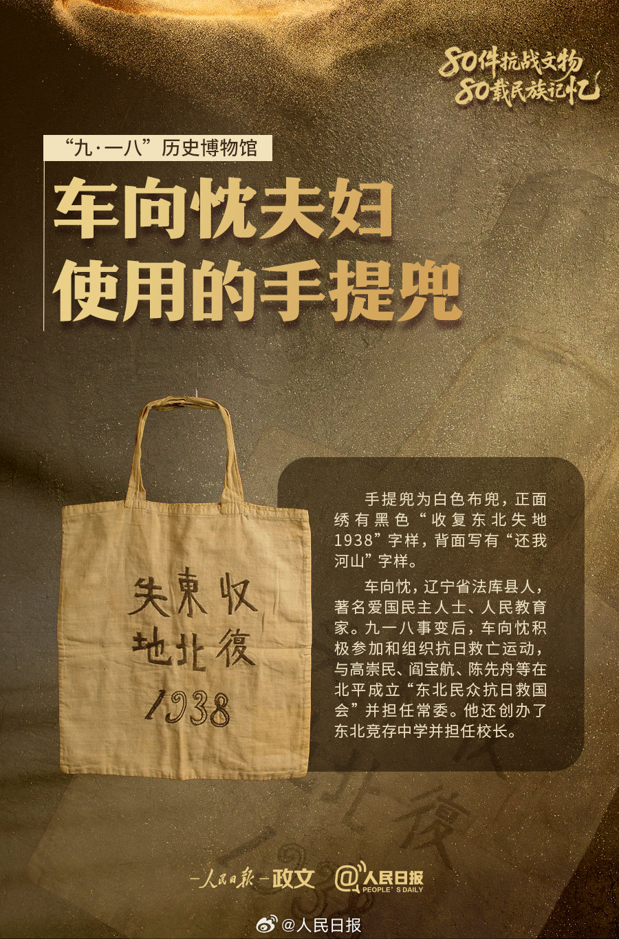 A+ A. A-抗日志士在狱中写下的遗书、绣有“收复东北失地 1938”“还我河山”字样的手提兜、东北抗联被服厂缝纫机……九一八事变爆发94周年,“80件抗战文物80载民族记忆”系列报道第七期,见证白山黑水间的不屈抗争↓↓铭记历史,守护永不褪色的抗战记忆!