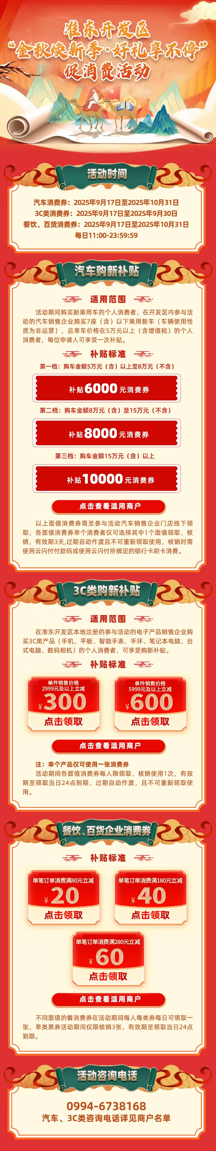 本次活动分时段、分类别进行:汽车、餐饮、百货消费券发放时间为9月17日至10月31日;3C数码消费券投放时间为9月17日至9月30日。