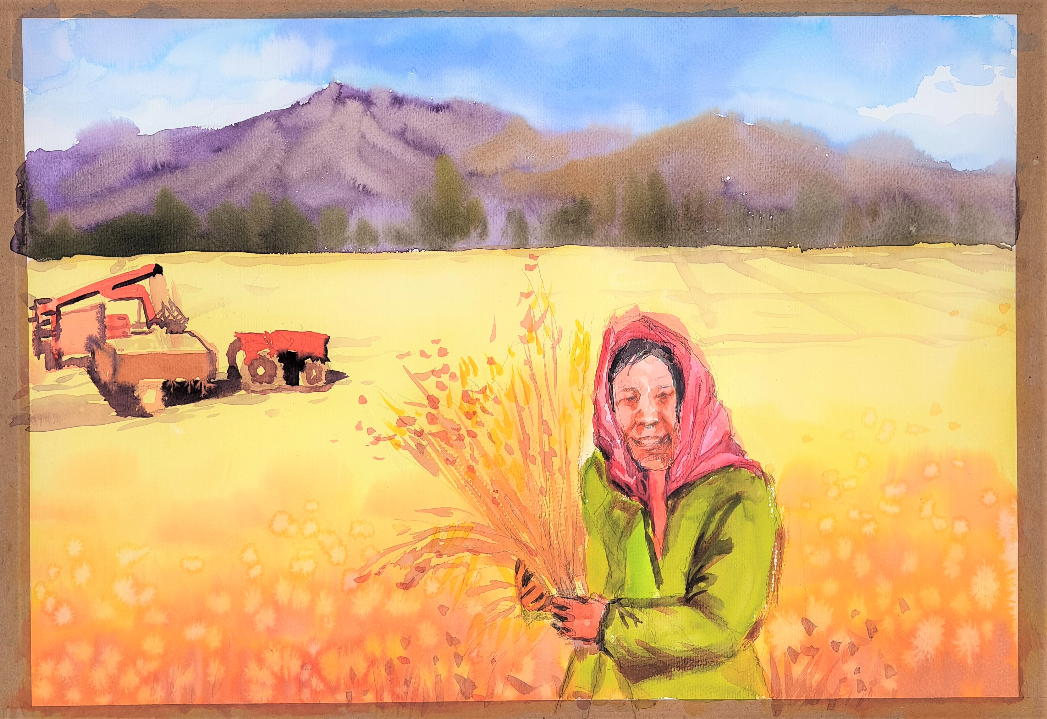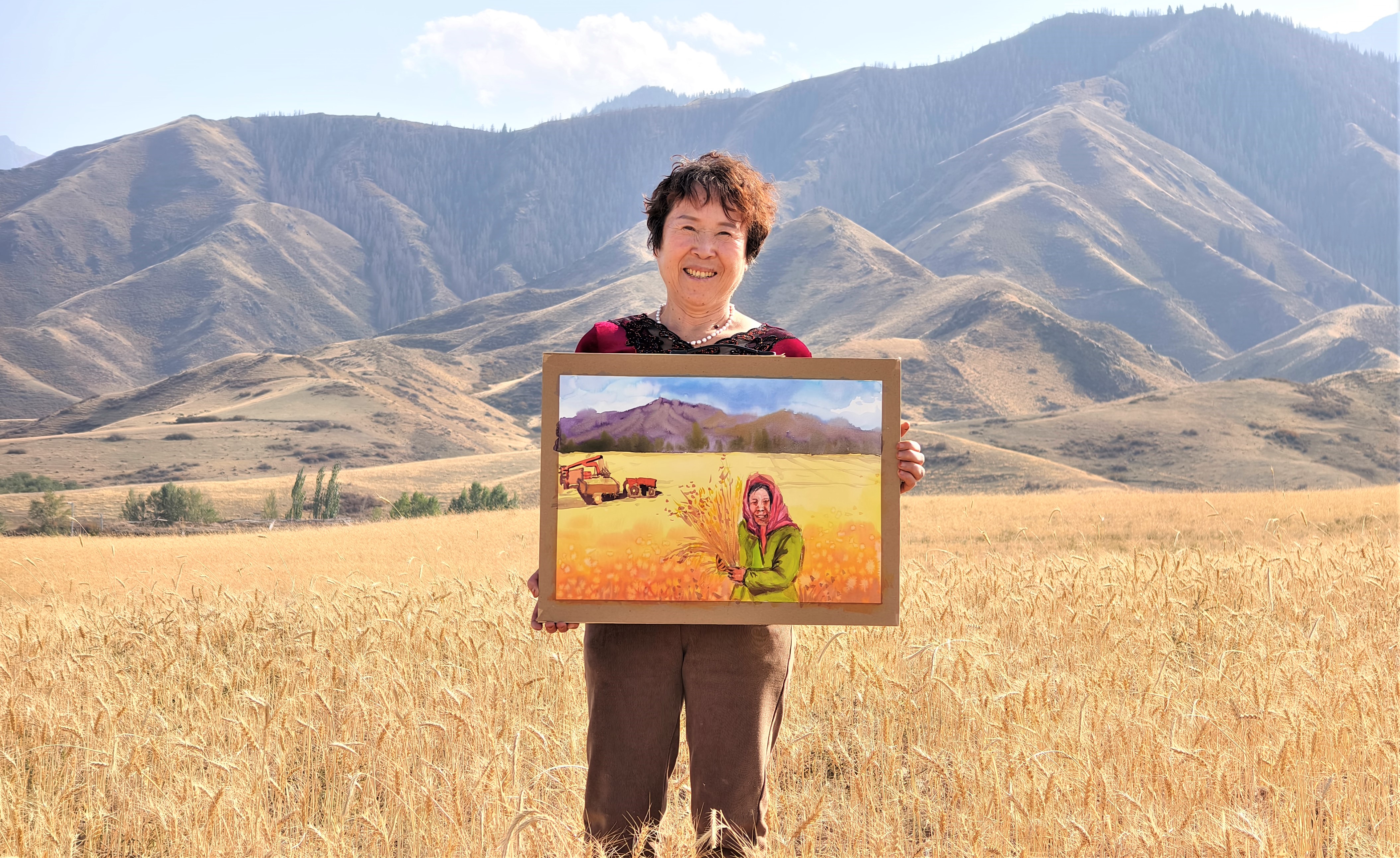 9月18日,昌吉回族自治州吉木萨尔县新地乡小分子村农民画创作者张新香正俯身调着水彩,画纸上,天山下的麦田已晕染成一片金黄。她蘸取橙红颜料,为穿梭在麦田间的联合收割机添上最后一抹灵动色彩。