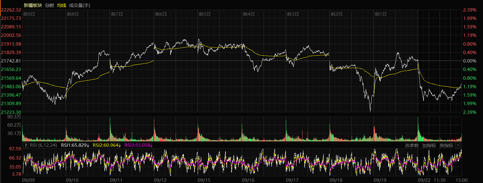 9月22日收盘时,新疆板块指数跌1.10%,报收21502.62点,16只股票上涨,45只股票下跌,个股上涨比例为26.23%,总换手率2.16%,总成交额233.06亿元。