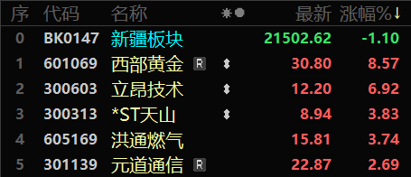 今日,西部黄金上涨8.57%,报收30.80元;立昂技术上涨6.92%,报收12.20元;*ST天山上涨3.83%,报收8.94元;洪通燃气上涨3.74%,报收15.81元;元道通信上涨2.69%,报收22.87元。汇嘉时代、天山股份、*ST新研、雪峰科技、*ST中基跌幅居前。