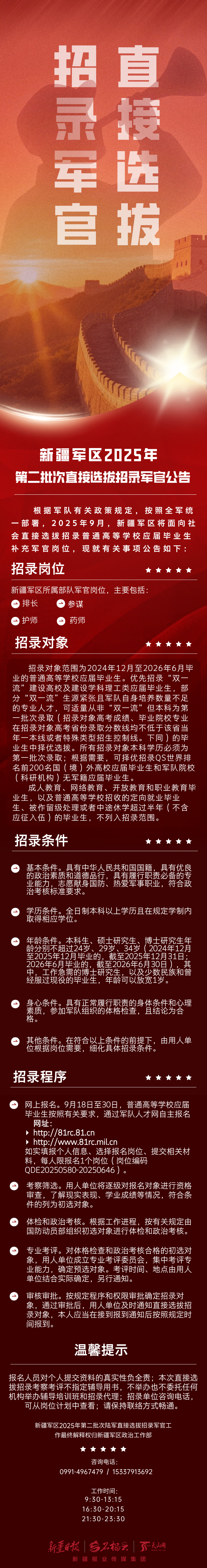 新疆军区2025年第二批次陆军直接选拔招录军官工作最终解释权归新疆军区政治工作部。