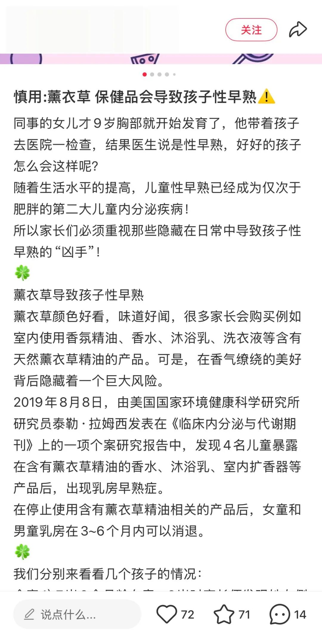 A+ A. A-薰衣草颜色好看、味道好闻,很多人都喜欢用带薰衣草精油的产品。但是,最近一位博主的帖子,却引起了很多有小朋友的家长的担忧: