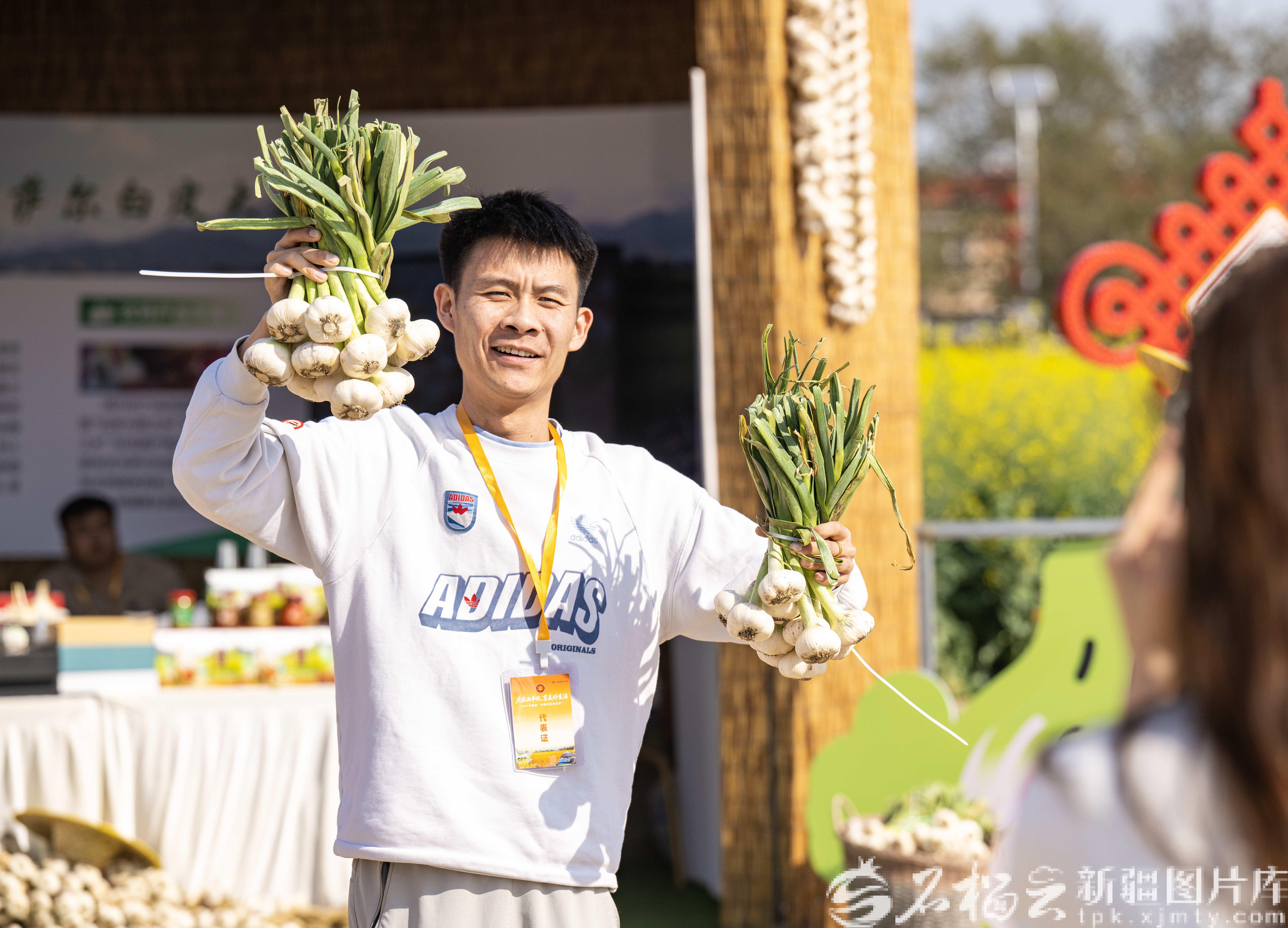 9月23日,2025年新疆“中国农民丰收节”主场庆祝活动在昌吉市六工镇十三户村举行。图为主播在活动现场推介新疆特色农产品。何龙摄