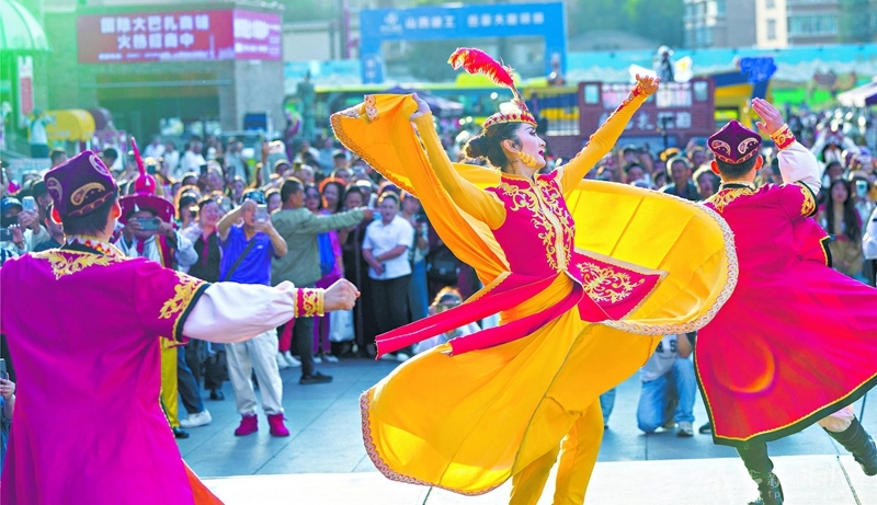 近日,游客在新疆国际大巴扎景区欣赏舞蹈。随着秋季旅游旺季到来,各地游客纷纷来到该景区拍照打卡,享受美好生活。 □孙振嵩摄