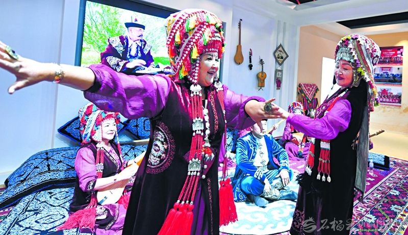 近日,在庆祝新疆维吾尔自治区成立70周年——克孜勒苏柯尔克孜自治州主题成就展展厅内,阿图什市民间艺人深情吟唱英雄史诗《玛纳斯》。图为民间艺人在吟唱中起舞。□石榴云/新疆日报记者汤永摄