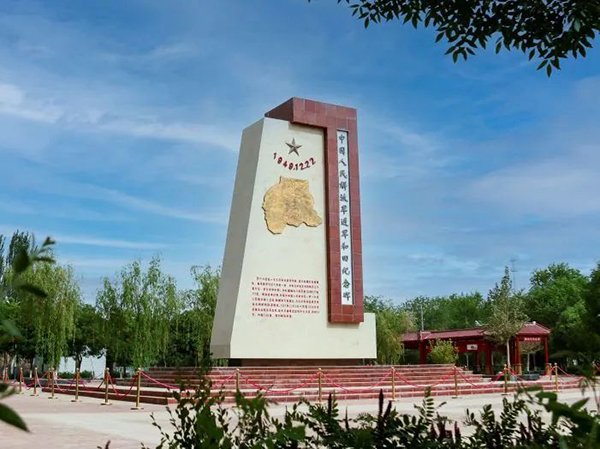 中国人民解放军进军和田纪念碑整体由红白两色的阿拉伯数字“4”和“7”构成,寓意47团。纪念碑宽7.19米,象征着抗日战争时期八路军一二零师三五九旅七一九团。碑高15米,设有两层台阶,上层五级,代表解放战争时期中国人民解放军二军五师十五团。老兵精神展示馆是沙海老兵精神的发源地,致力于为广大职工群众提供科普教育,被评为国家AAAA级旅游景区。