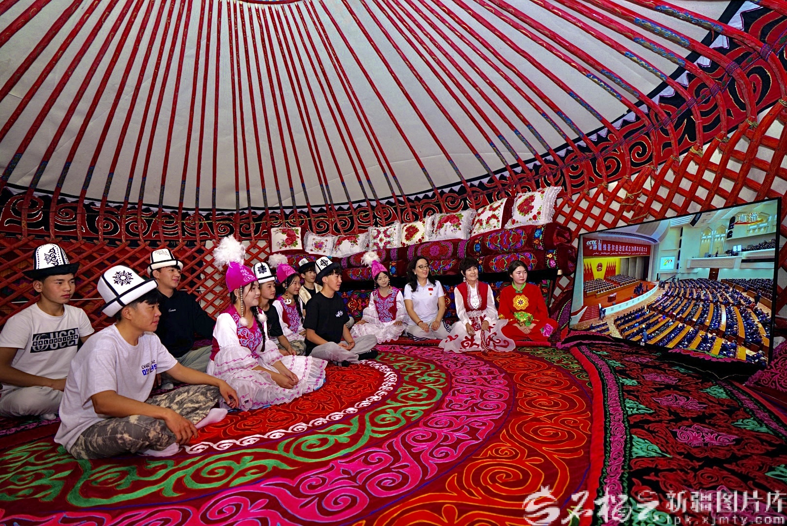 9月25日,克孜勒苏柯尔克孜自治州阿图什市,非物质文化遗产柯尔克孜族刺绣代表性传承人努尔加玛丽·托和提(前排右二)和她的学生们一同观看新疆维吾尔自治区成立70周年庆祝大会直播。谢智摄