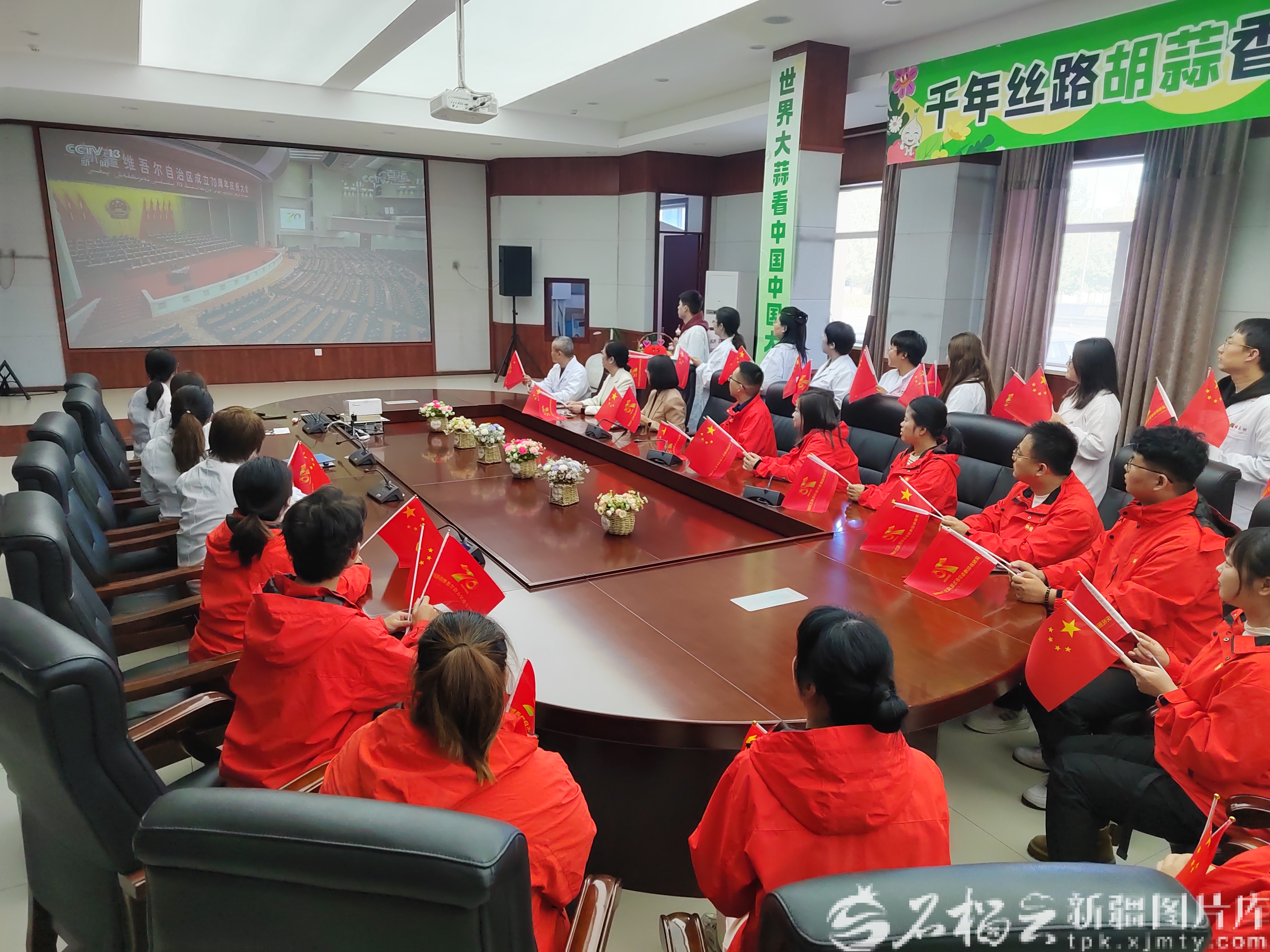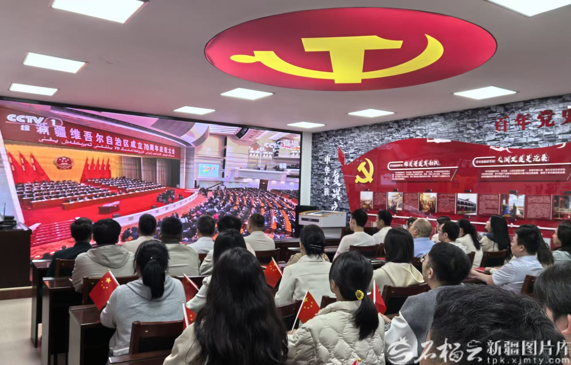 9月25日,共青团库尔勒市委员会组织100余名西部计划志愿者观看新疆维吾尔自治区成立70周年庆祝大会直播。石榴云/新疆日报记者 王立华摄