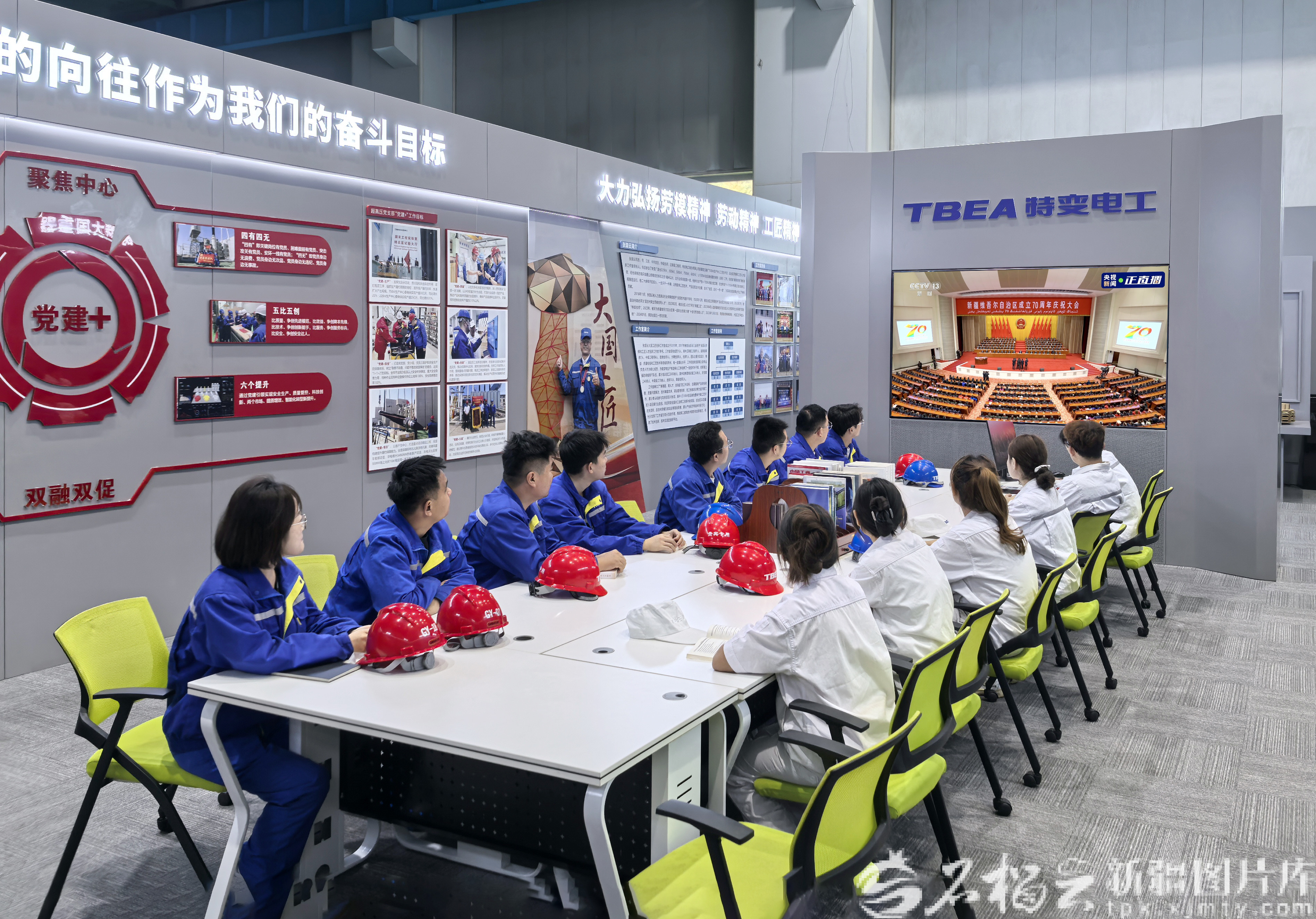 9月25日,特变电工股份有限公司新疆变压器厂超高压生产中心生产一线员工观看新疆维吾尔自治区成立70周年庆祝大会直播。侯佳鹏 摄