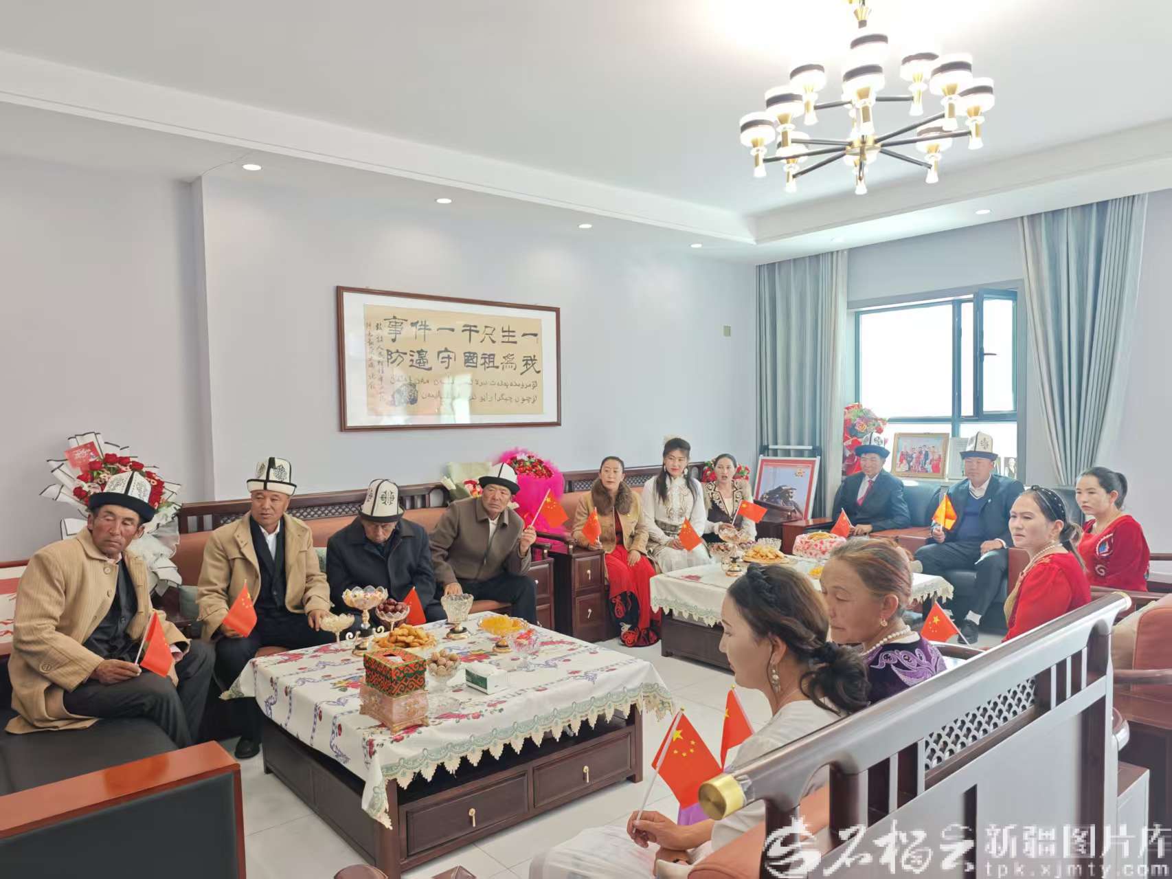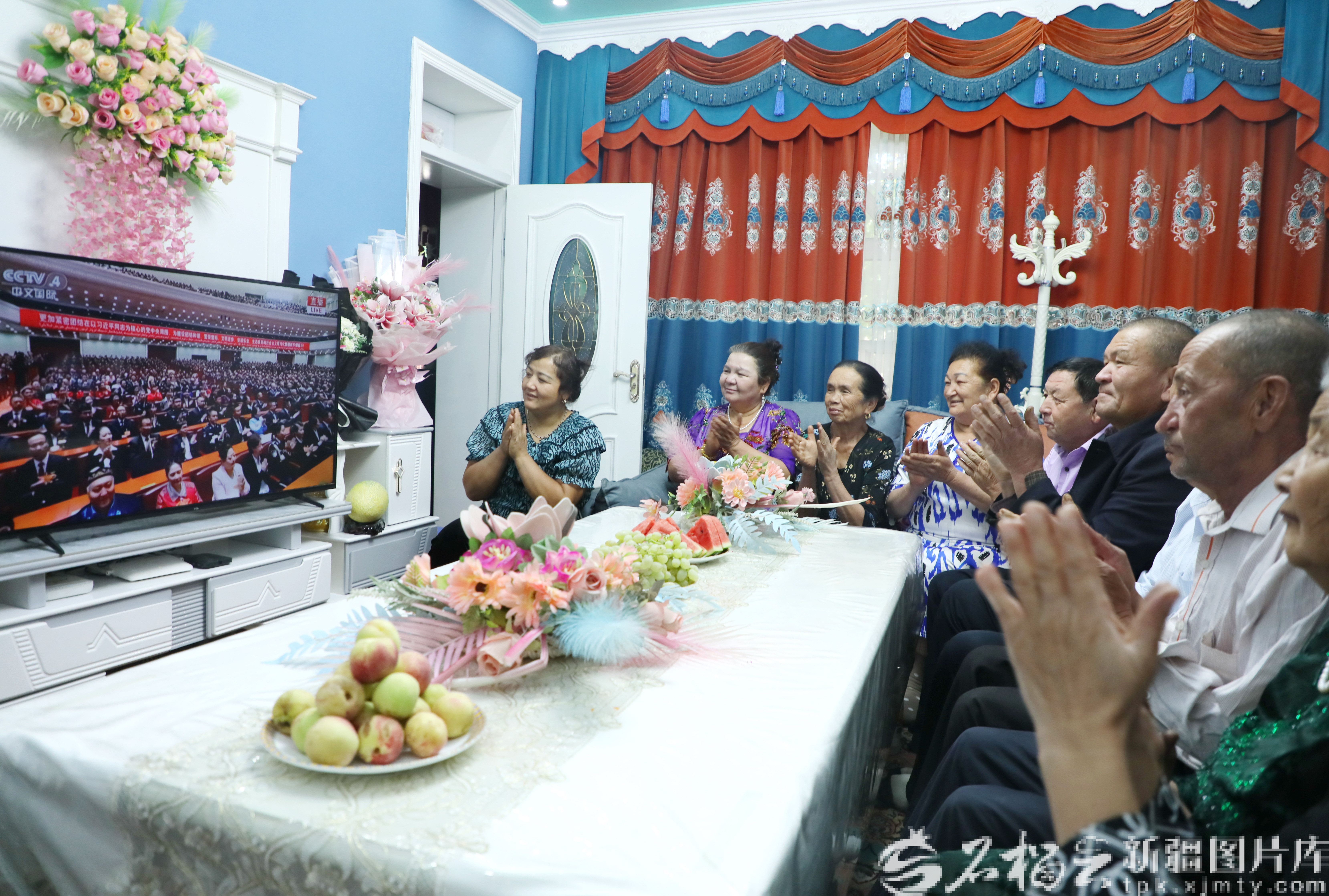 9月25日,“人民楷模”国家荣誉称号获得者布茹玛汗·毛勒朵的家人和乌恰县吉根乡萨孜村村干部、护边员一起在她的家里收听收看新疆维吾尔自治区成立70周年庆祝大会直播。谷成玲 摄