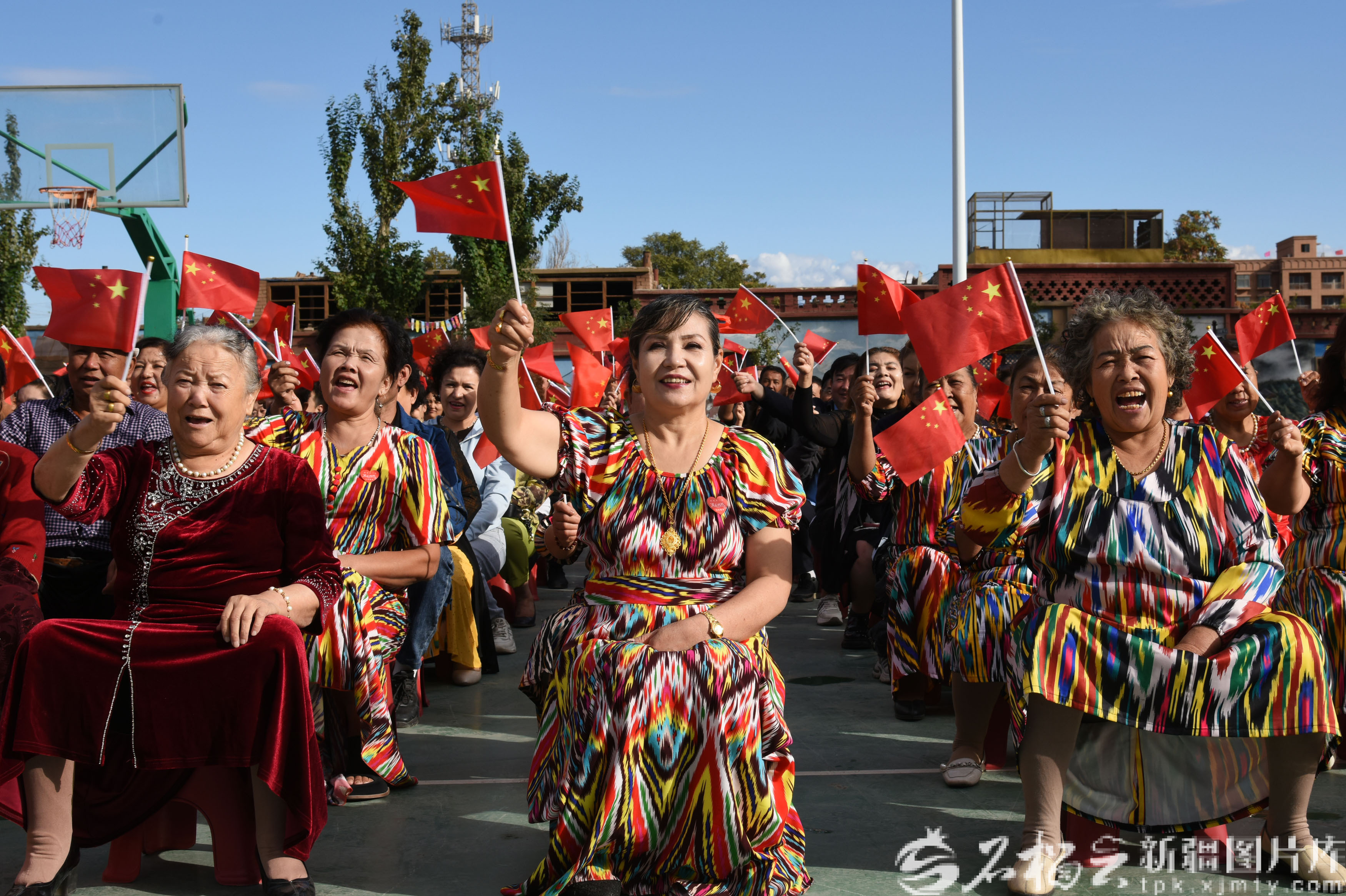 9月25日,乌鲁木齐市天山区黑甲山街道跃进街南社区各族居民一起收听收看新疆维吾尔自治区成立70周年庆祝大会直播。石榴云/新疆日报记者 约提克尔·尼加提摄