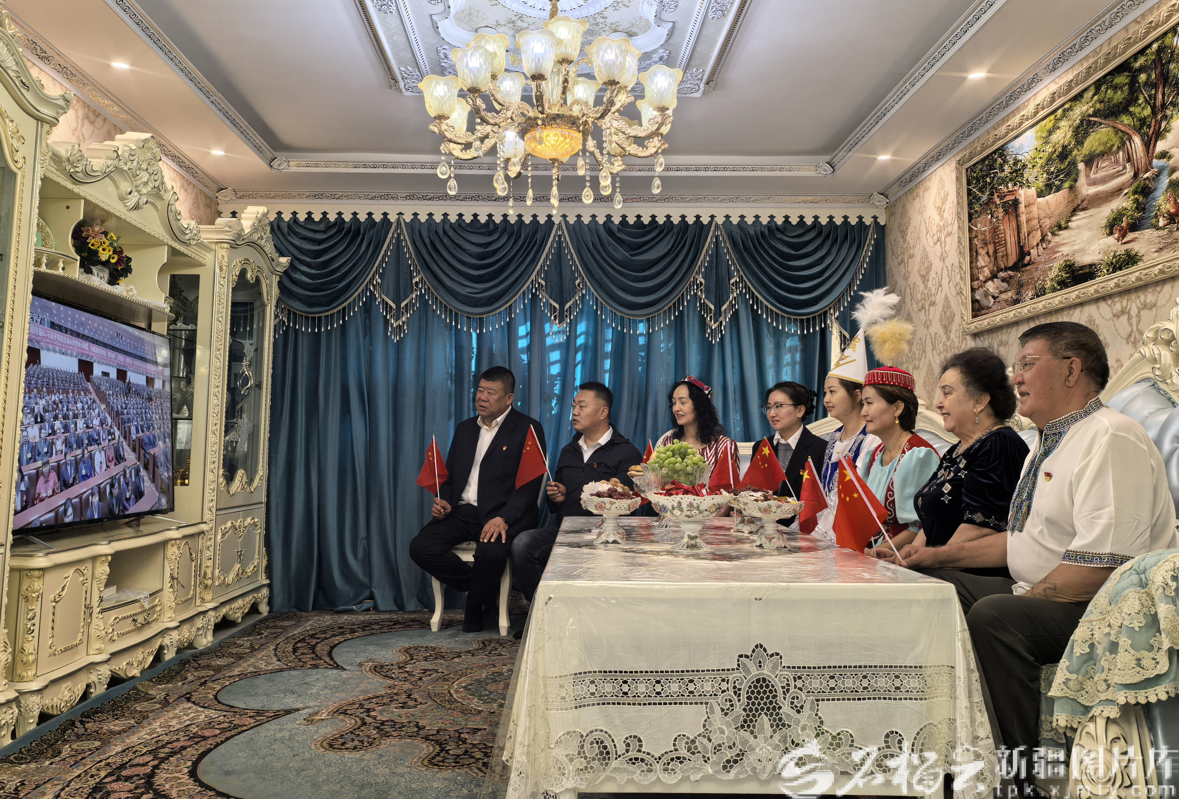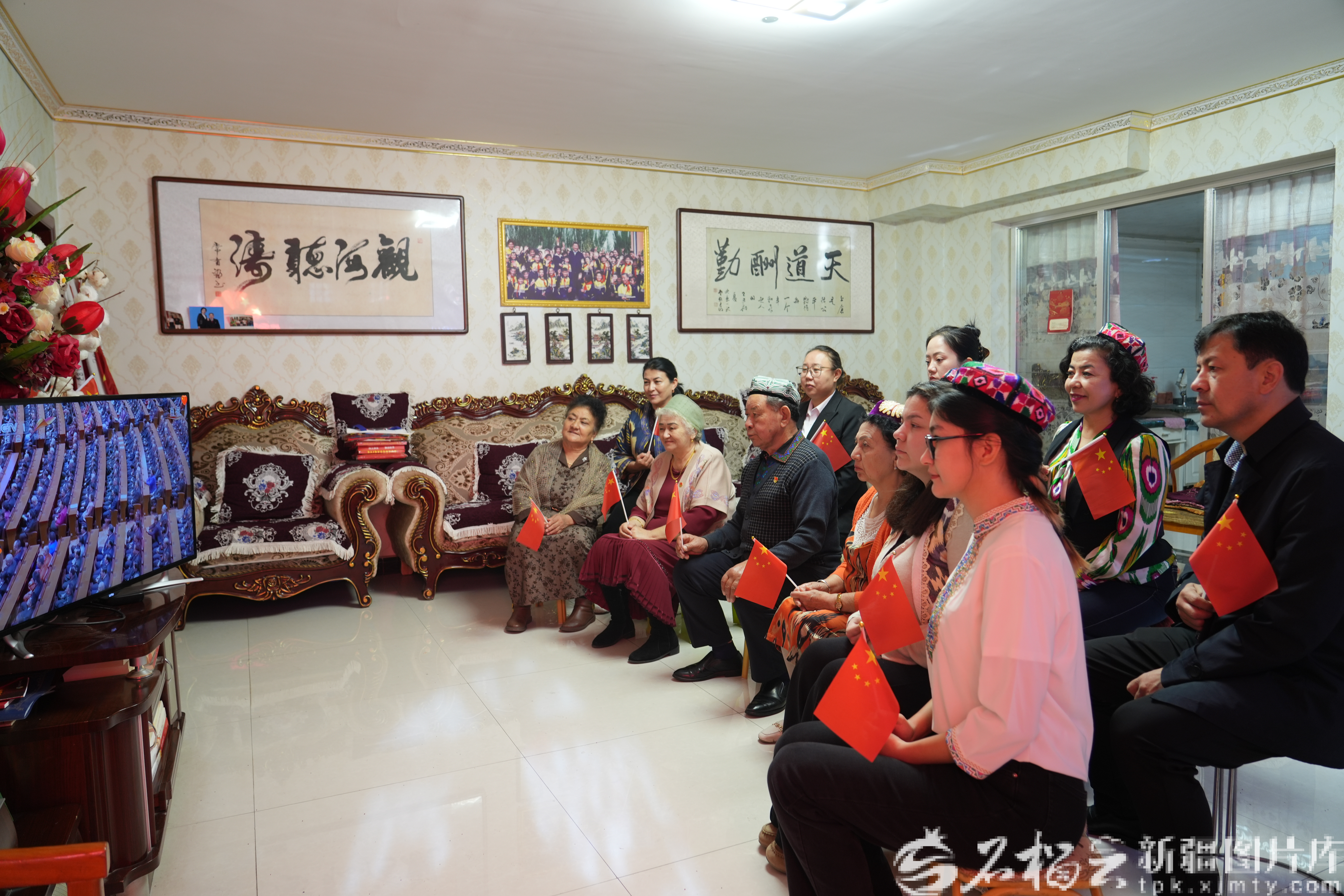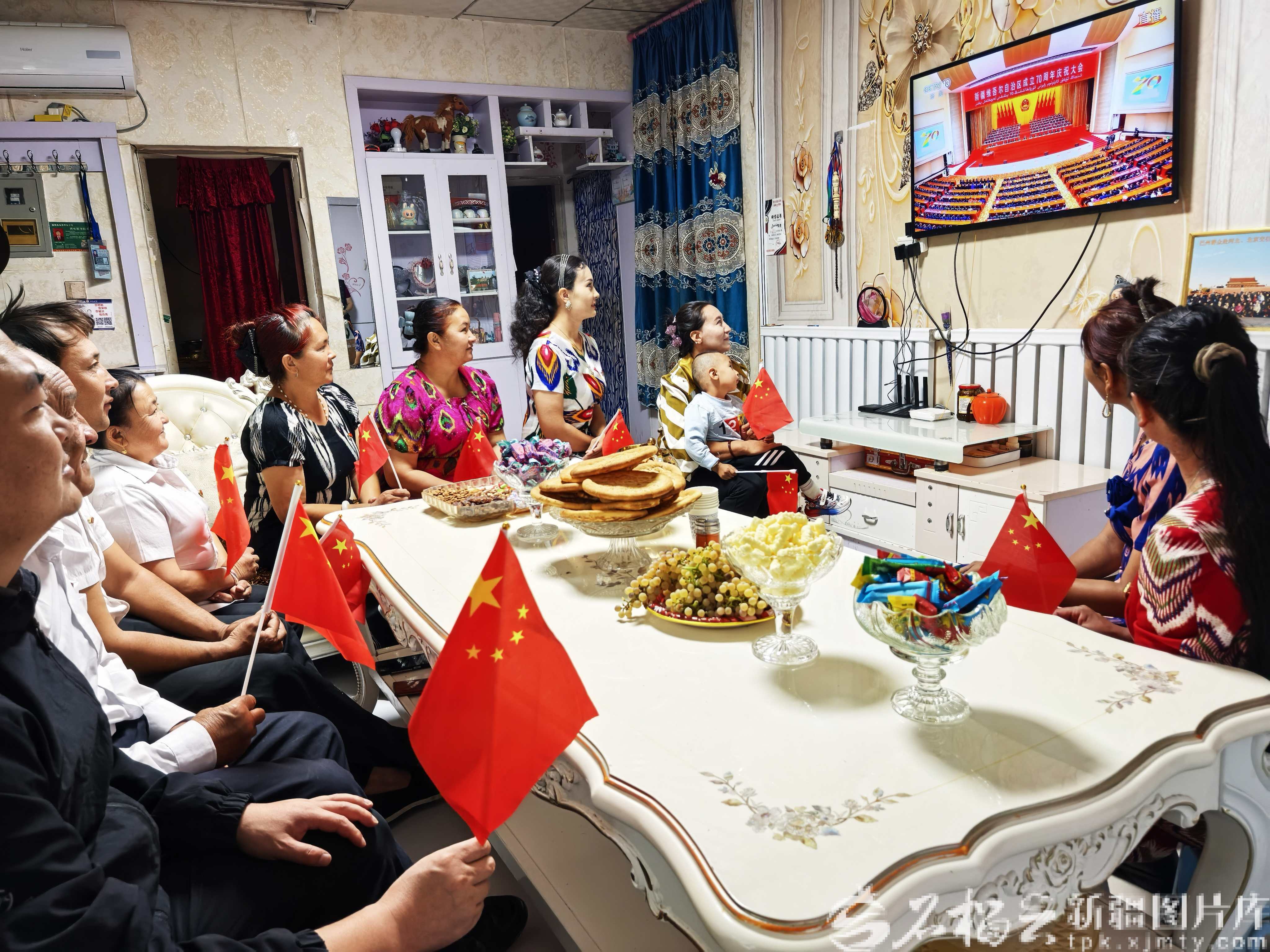 9月25日,塔城市新城街道哈尔墩社区居民沙勒克江·依明(前排左三)和邻居一起收听收看新疆维吾尔自治区成立70周年庆祝大会直播。素德别力克摄