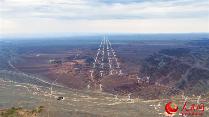 一座座银色铁塔耸立山野荒漠,这条“光明丝路”跨越2260公里,将新疆电送到重庆。人民网 李欣洋摄