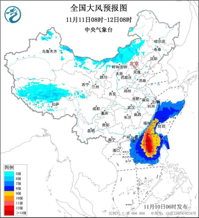 11月11日8时至12日8时,新疆北部、内蒙古中西部、辽东半岛、西藏西部和中部、福建东部沿海、广东东部沿海、台湾岛等地有5~6级、阵风7级的大风;东海大部海域、台湾海峡、巴士海峡、南海北部和中部海域将有7~9级、阵风10~11级的大风,其中南海东北部和中东部海域、台湾海峡部分海域的风力可达10~11级,阵风12~13级,台风“凤凰”中心经过的附近海域风力有12~14级,阵风15~16级。