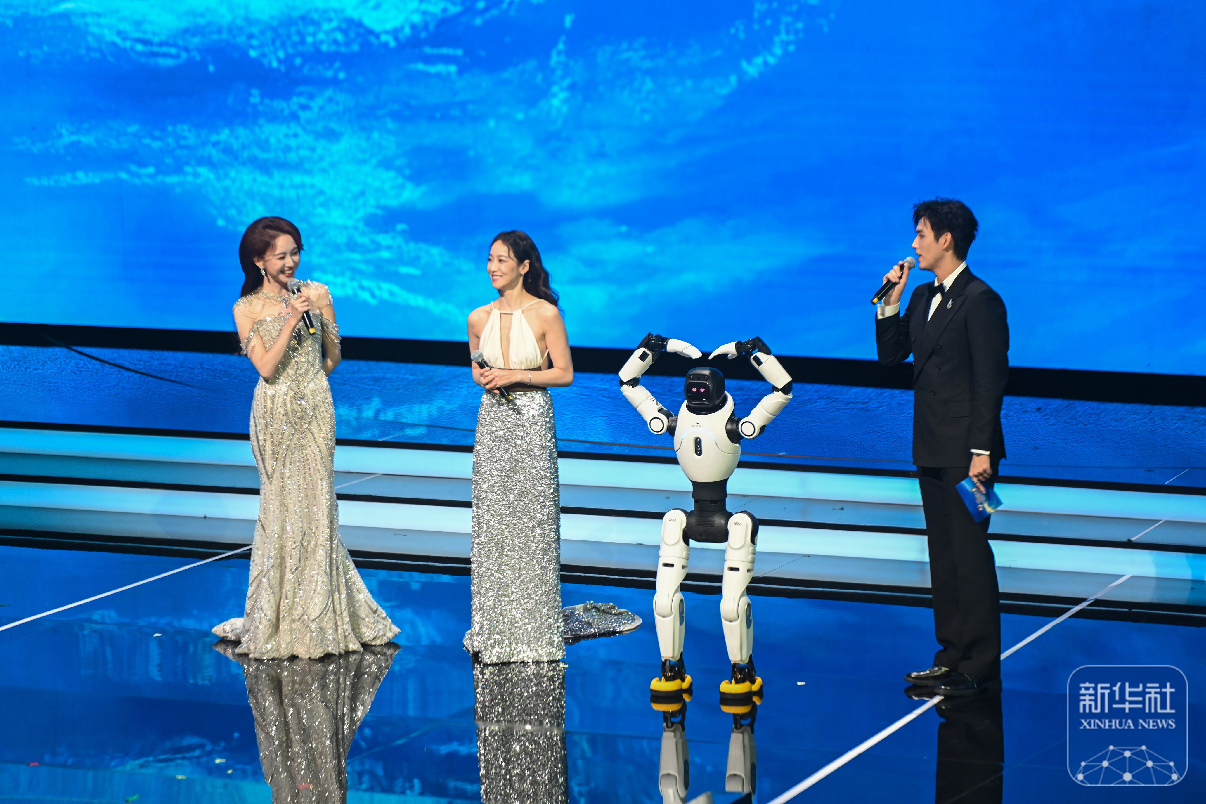 ↑ 11月11日晚,主持人在2025年中国金鸡百花电影节开幕式现场与机器人互动。