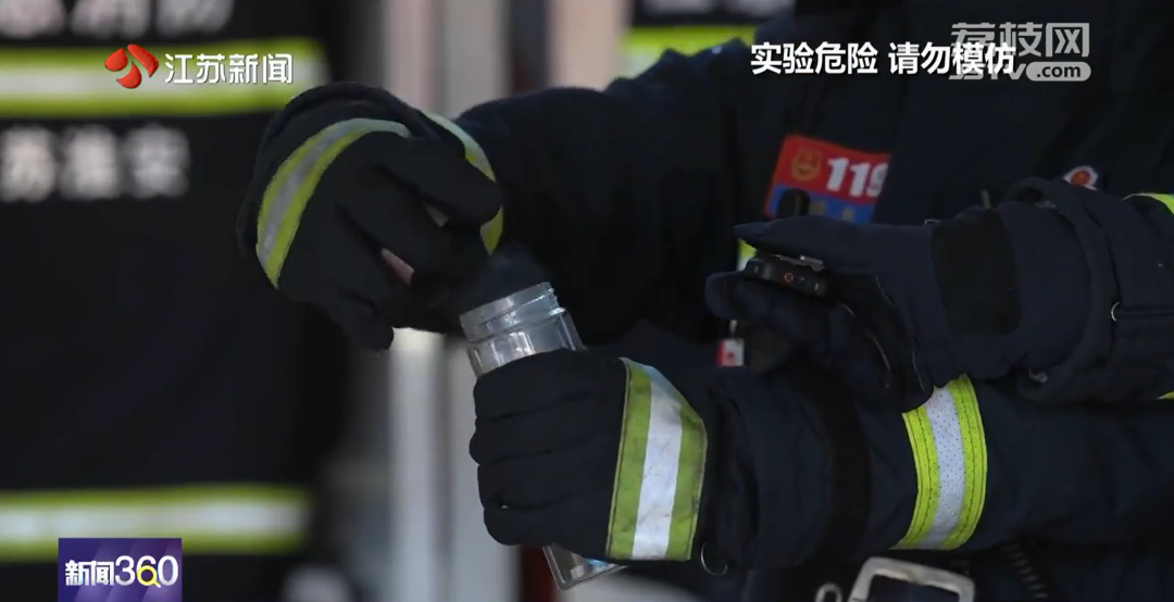 消防员在保温杯内加入热水和泡腾片后迅速拧紧杯盖,摇晃过程中保温杯发生爆炸。