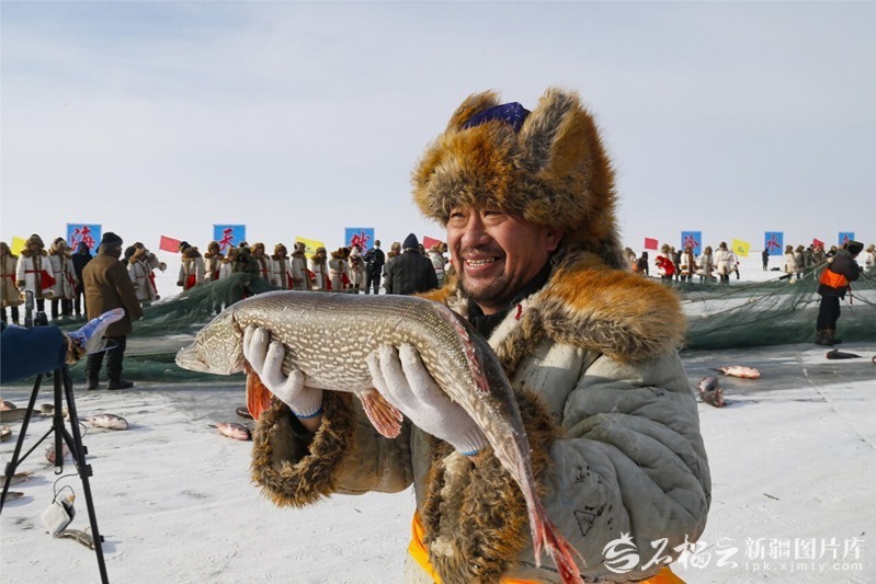 在福海县冬捕节上,鱼把头向观众展示刚刚捕获的一条大“狗鱼”。天山网-新疆日报记者 谢龙摄