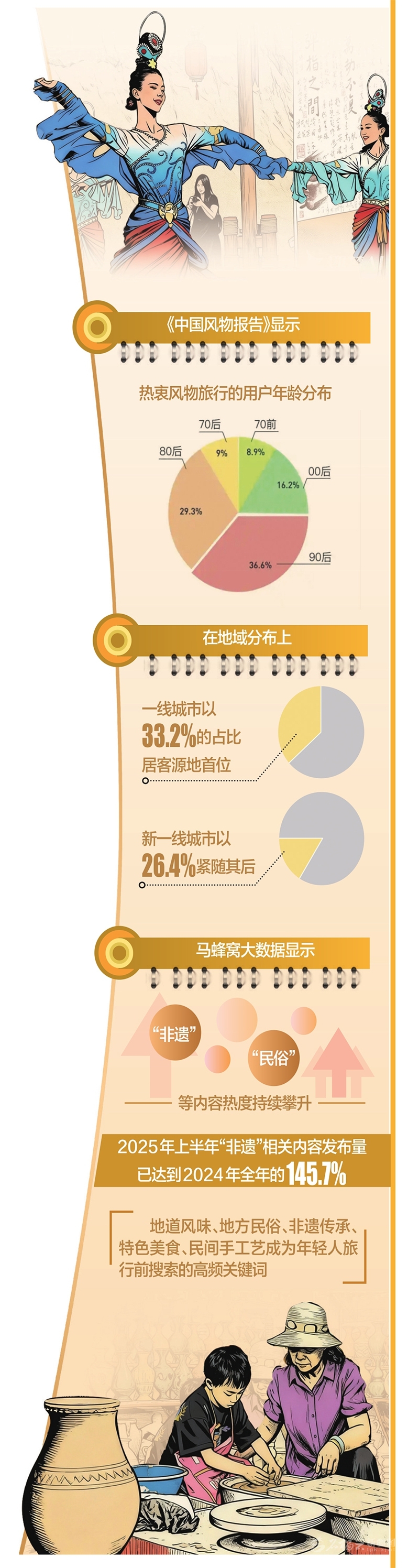 《中国风物报告》显示,游客已过了“看山看水”的阶段,开始追寻各地的文化之美和生活之趣。王晓雪介绍,90后以36.6%的占比成为风物旅行主力,80后以29.3%紧随其后,00后则以16.2%的占比显示出巨大潜力。