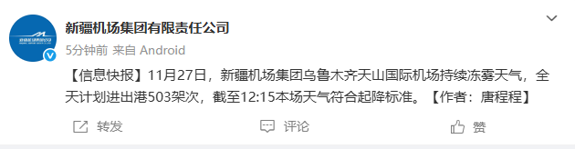 A+ A. A-11月27日上午,新疆机场集团有限责任公司微博发布信息显示,11月27日,新疆机场集团乌鲁木齐天山国际机场持续冻雾天气,全天计划进出港503架次,截至12:15,天气符合起降标准。