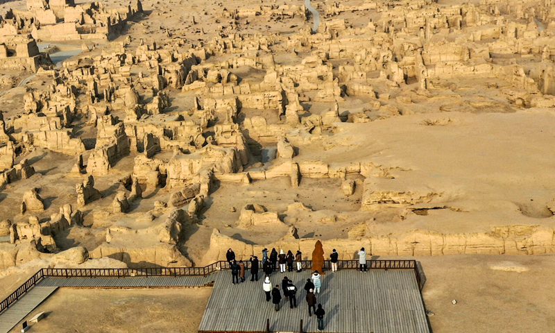 游客在交河故城景区游览(无人机摄)。天山网新疆日报记者 周鹏摄