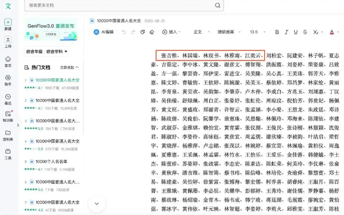 实际上,照抄“人名大全”的远不止杭州师范大学这份公示名单。记者留意到,“张吉惟、林国瑞、林玟书、林雅南、江奕云”,这5个名字是这份“人名大全”中的前五个名字,也是各类“复制粘贴”名单中扎堆出现的名字,甚至它们连排列顺序都一模一样。