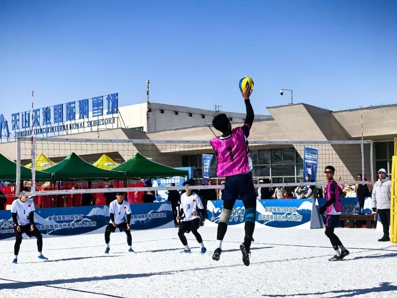 游客在天山天池国际滑雪场体验雪上排球项目。天山天池风景名胜区供图
