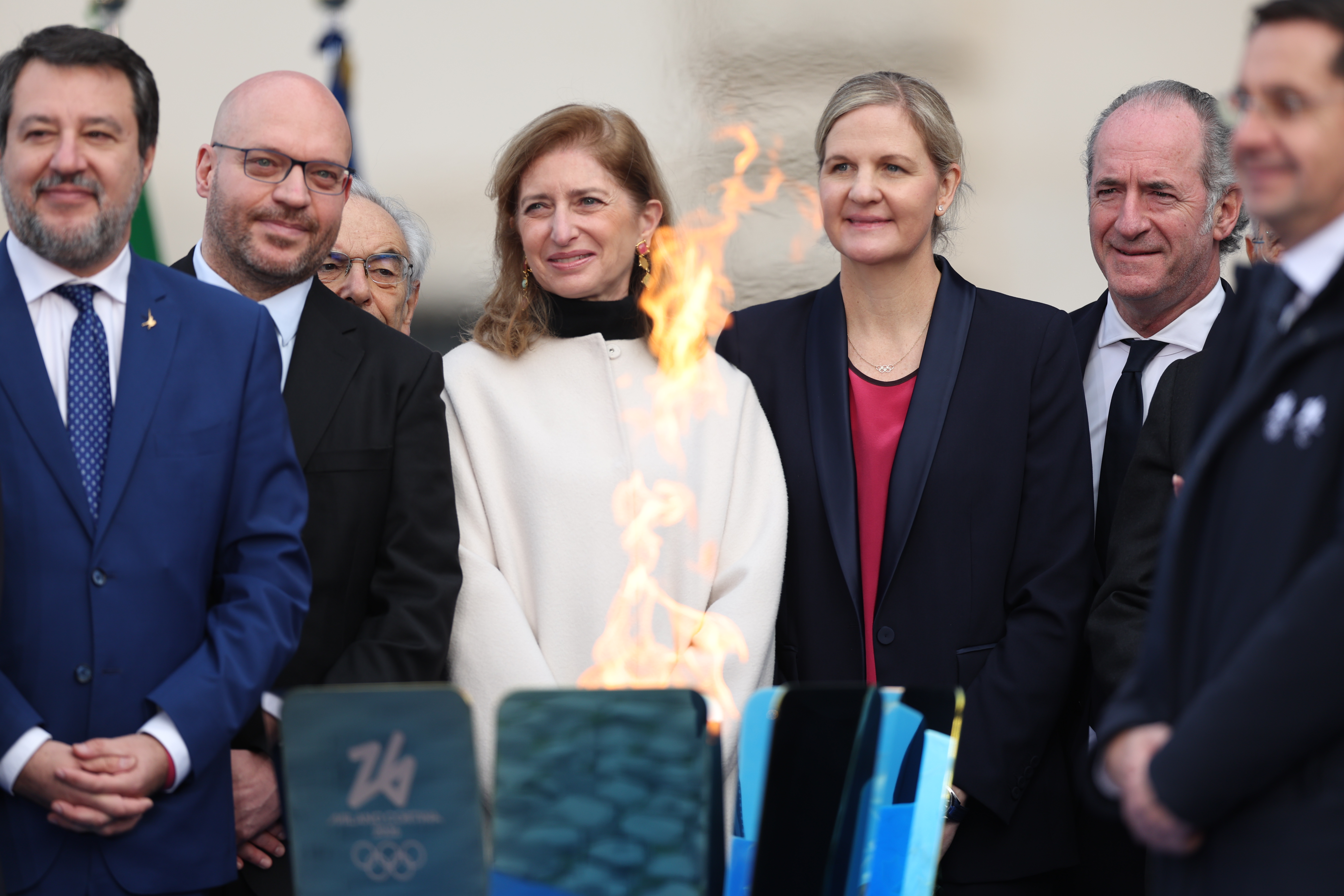 12月5日,国际奥委会主席考文垂(右三)与嘉宾在2026年米兰-科尔蒂纳冬奥会火炬接力庆典火盆点燃仪式上。新华社记者 李京 摄