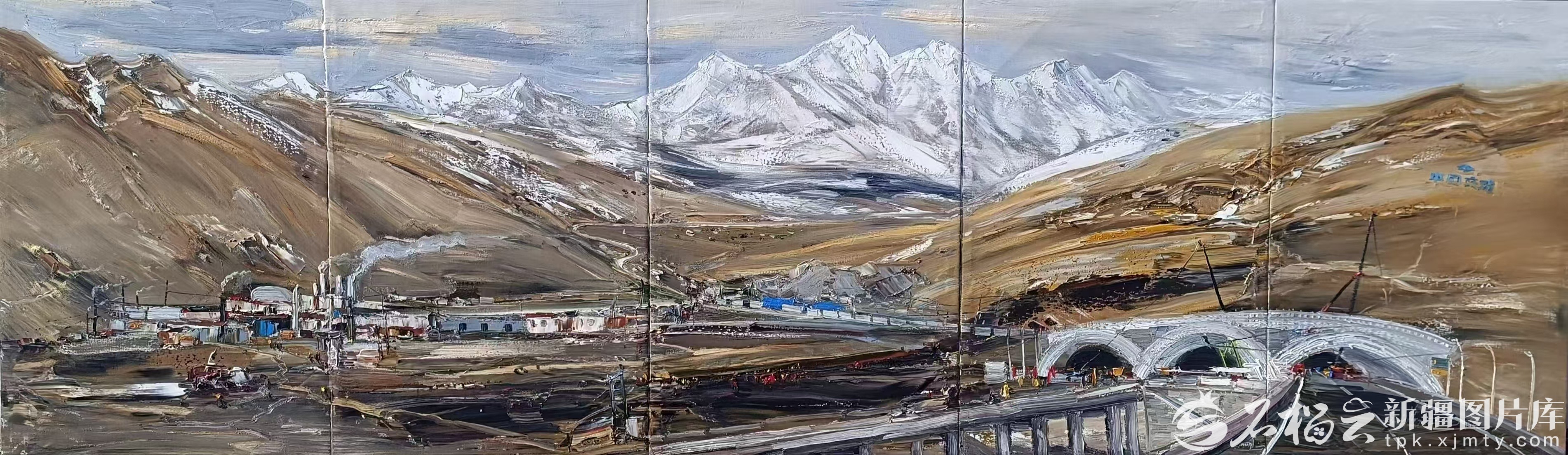 从正午艳阳高照到日落寒意渐起,孟二虎笔下的画面一点点凝固。隧道口的白色框架结构与远方雪山遥相呼应,深秋萧瑟的大地底色,愈发衬托出施工现场的热气腾腾。这幅融合了动与静、冷与暖的作品,在4个多小时里一气呵成。