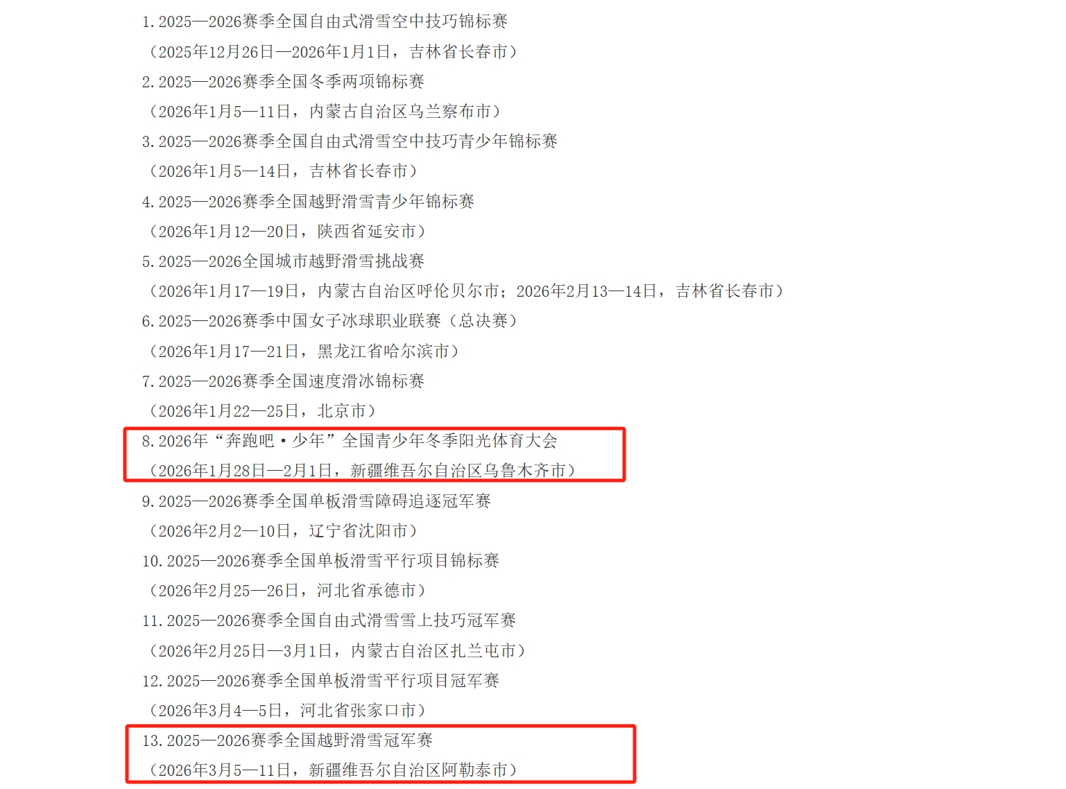 A+ A. A-近日,国家体育总局、文化和旅游部发布“跟着赛事去旅行”2025—2026全国冰雪赛事活动目录,其中,我区将承办两项重要赛事:2026年1月28日—2月1日在乌鲁木齐市举办的2026年“奔跑吧·少年”全国青少年冬季阳光体育大会,以及2026年3月5日—11日在阿勒泰市举办的2025—2026赛季全国越野滑雪冠军赛。