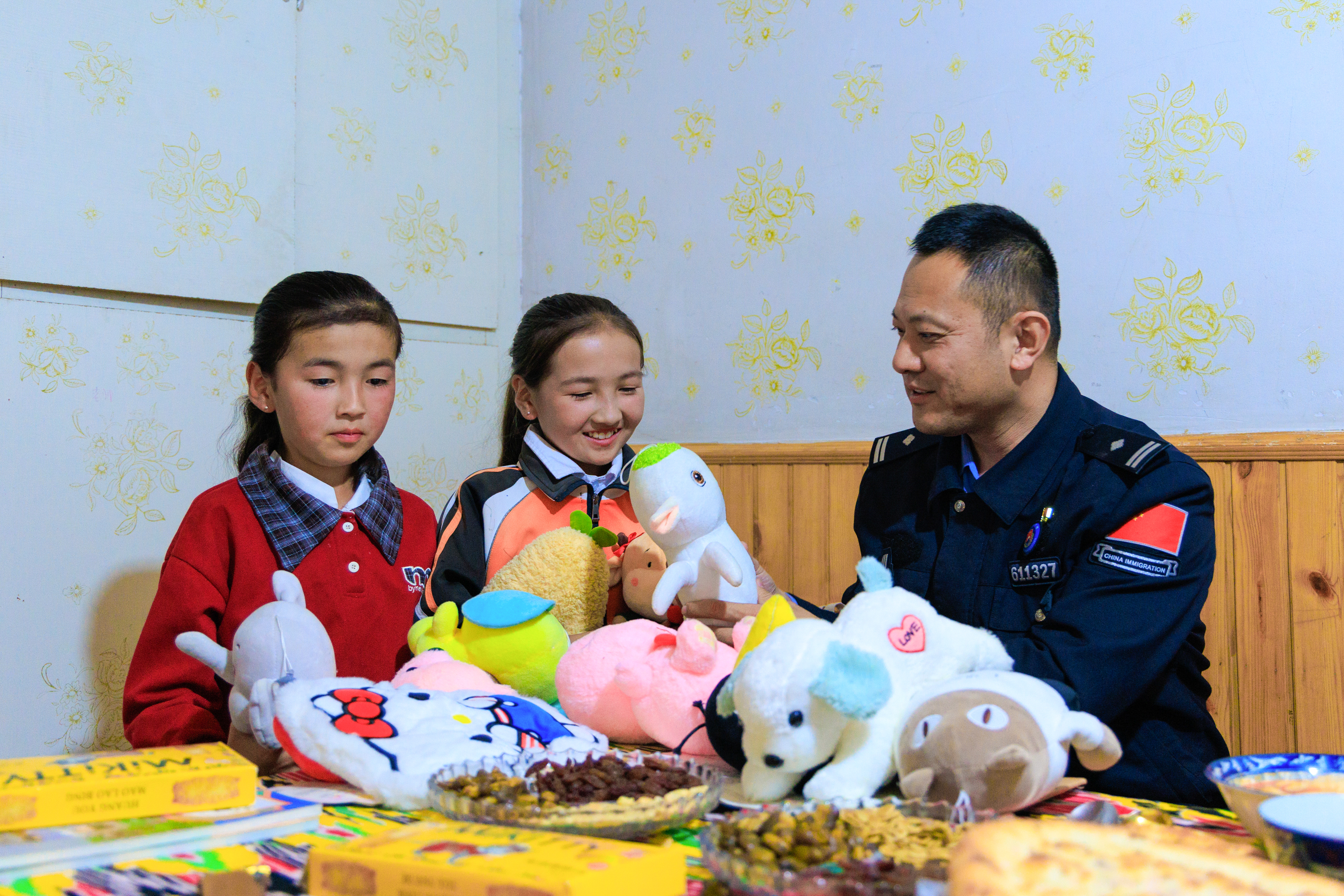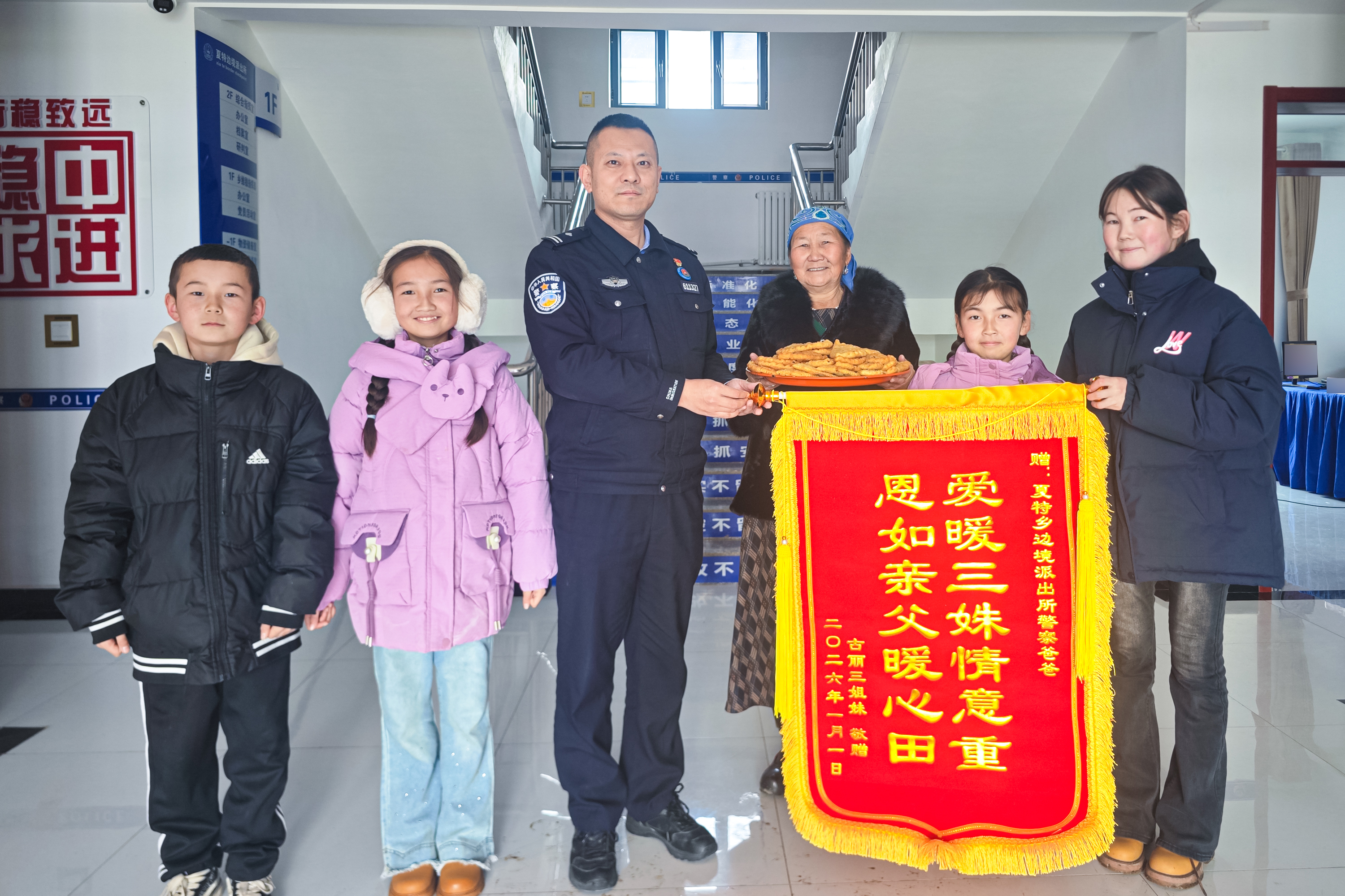 1月7日一大早,昭苏县夏特柯尔克孜族乡玛热勒特村的古丽三姐妹挽着奶奶的手带着表弟,端着刚炸好的菜盒子,捧着一面锦旗,来到伊犁边境管理支队夏特边境派出所。锦旗上“爱暖三姝情意重 恩如亲父暖心田”的烫金大字,在冬日暖阳下熠熠生辉,这是送给她们的“警察爸爸”——派出所政治教导员李皓光最真挚的警察节礼物。