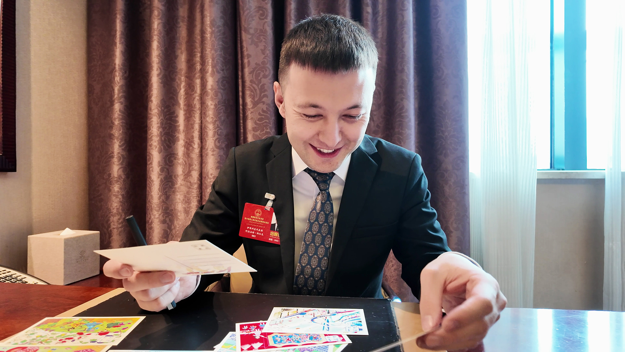 1月26日,出席新疆维吾尔自治区政协十三届四次会议的政协委员展示“童绘新疆”明信片。(摄影:马海君)